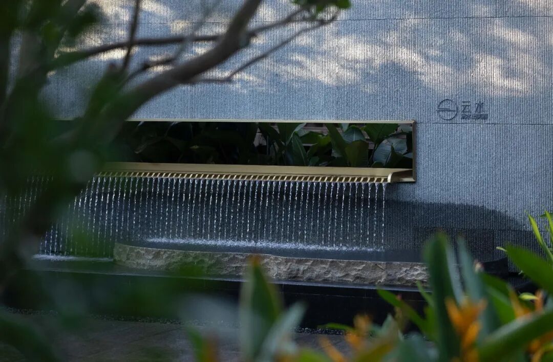 为营造更为精致的空间氛围,入口跌水的错层与置石的摆放都是经过精心推敲的结果。采用了边角倒圆弧的退台与质感石材搭接,外包香槟金不锈钢饰面,流露出一份精致雅趣。
