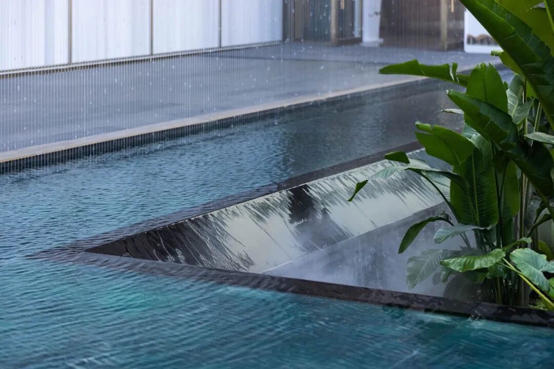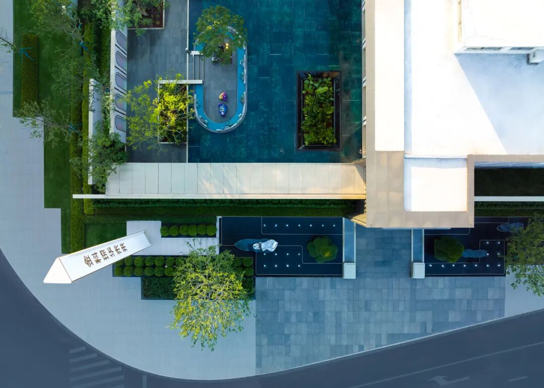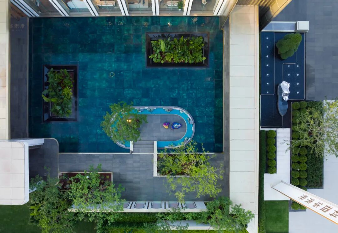 池底的翠蓝是由定制琉璃拼贴而成,这种特殊属性材质在设计师反复推敲中得以呈现,阳光下、夜光中,形成独一无二的翠蓝。水之韵、水之形、水之色、水之蓝充斥着整个空间形成点睛之色。