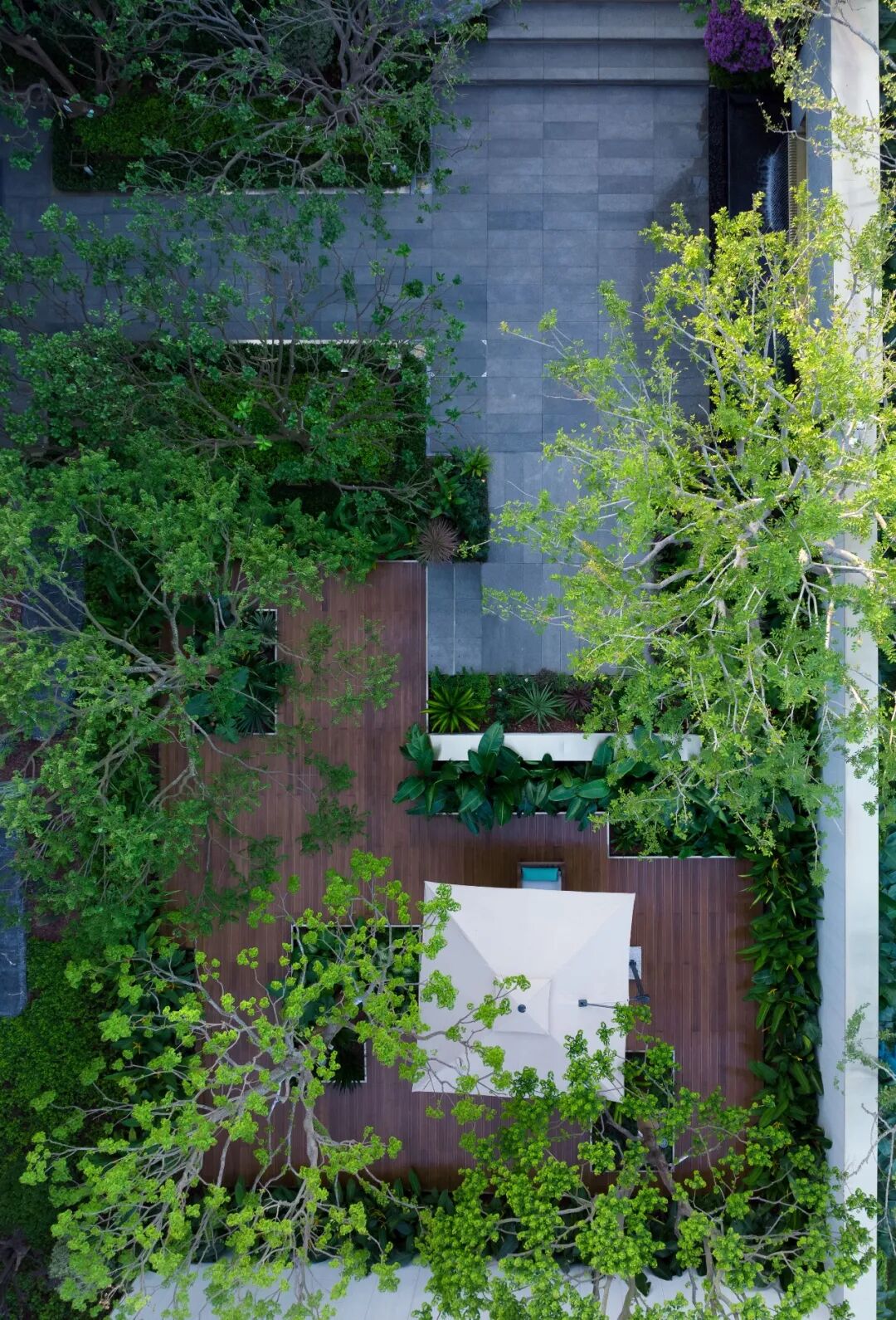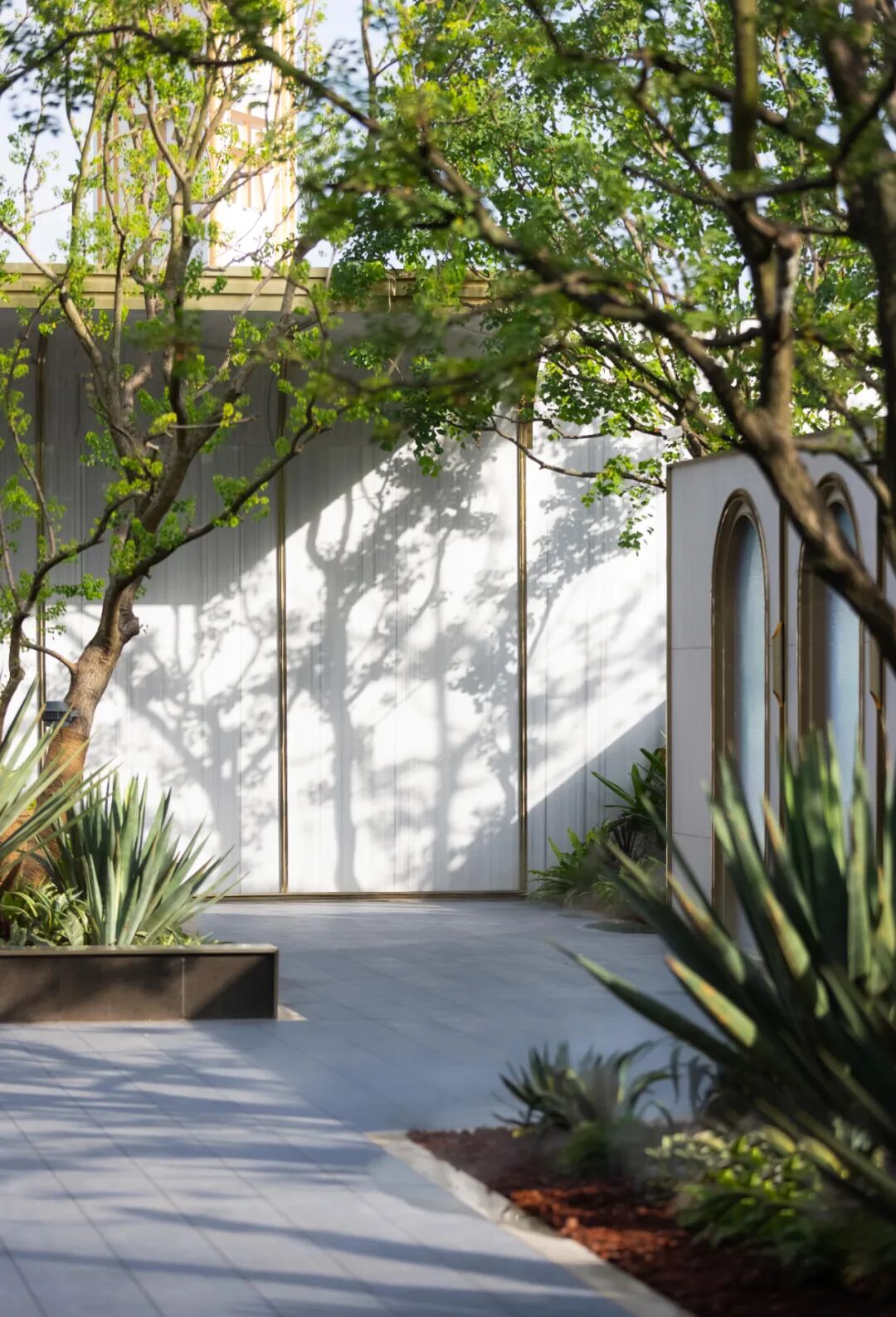 带有纹理感的景墙面与变幻的霓虹玻璃相结合,红色砾石与肆意生长的植物加之点缀,呈现的是理性几何线条与优雅装饰主义结合的秩序系统,展现出一个梦幻般的画境,满溢着阳光与自然而来,浮光跃金,树影照壁。