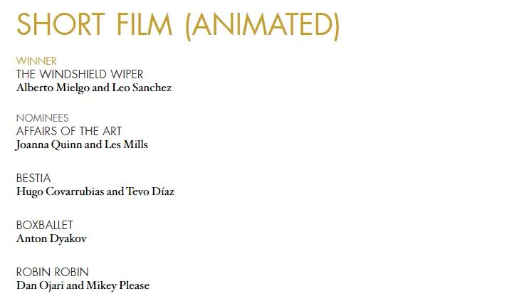 第94届奥斯卡最佳动画短片的提名作品分别为《知更鸟罗宾》《艺术事务》《兽性》《拳击芭蕾》,凭借出色的风格和深度的剧情思考,《皆为爱》在众多优秀作品突出重围!