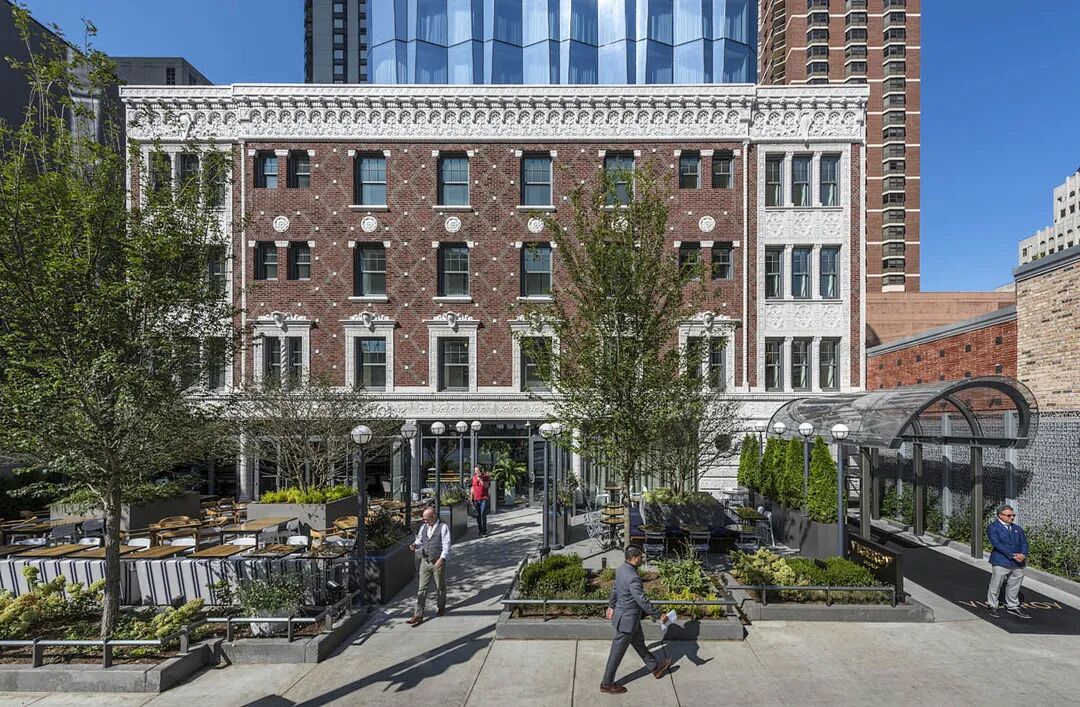 总督酒店的独特形象通过新塔楼和历史建筑的对比立面出现。1920年代雪松酒店的立面采用砖和赤陶板体现了建筑立面复古的特征,作为装饰的元素进行了二维的排列。相比之下,新酒店大楼的玻璃幕墙是简洁的立体结构,独特的“折叠”几何形状的灵感来自下方历史悠久的砖砌外墙中的菱形图案。设计解决方案创造了“对比中的和谐”,是芝加哥市中心城市更新的典型案例之一。
