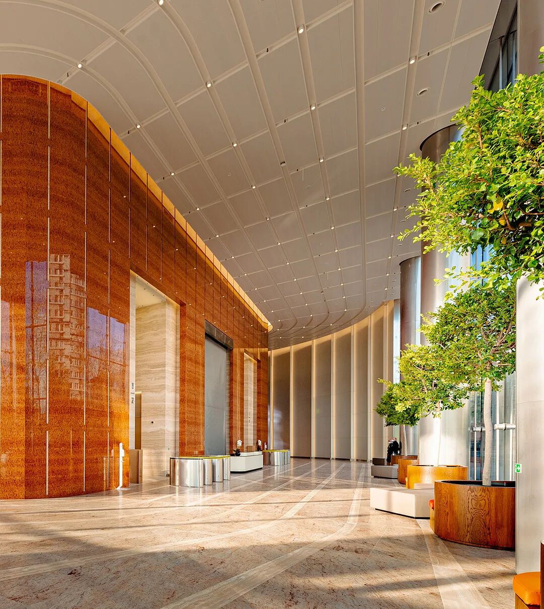 办公的三层大堂采用拉索来支撑透明玻璃,模糊了室外和室内空间的界限。塔楼核心筒使用大块石板,与大堂的轻盈形式形成鲜明对比,突出了核心筒的坚实体量。2,000 平方米的塔楼平面提供了一个几乎无柱的空间,拥有 11 至 13 米的租赁跨度和 1.35 米的轴线。