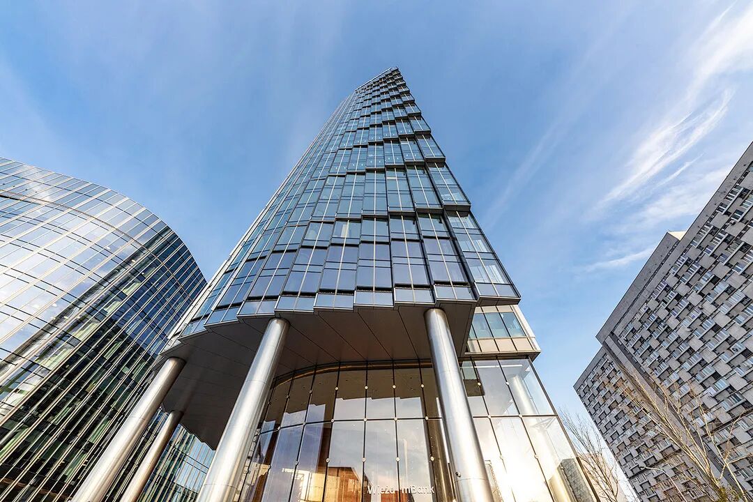 CHICAGO – (January 26, 2022) — Global architecture firm Goettsch Partners (GP) announces the completion of Mennica Legacy Tower, a new 115,000-square-meter, two-building office complex in Warsaw anchored by mBank, one of Poland’s largest banking institutions, and leading co-working provider WeWork. Located at the intersection of Prosta and Żelazna streets in the CBD, the 35-story and 10-story office buildings open to a large, landscaped plaza, with a pedestrian path that winds between them. The project was developed by an affiliate of Golub & Company LLC and Mennica Towers GGH MT Sp z o.o. S.K.A., and delivered in collaboration with Epstein, a design firm with offices in both Chicago and Warsaw that served as the architect and engineer of record, as well as the structural and MEP design engineer.