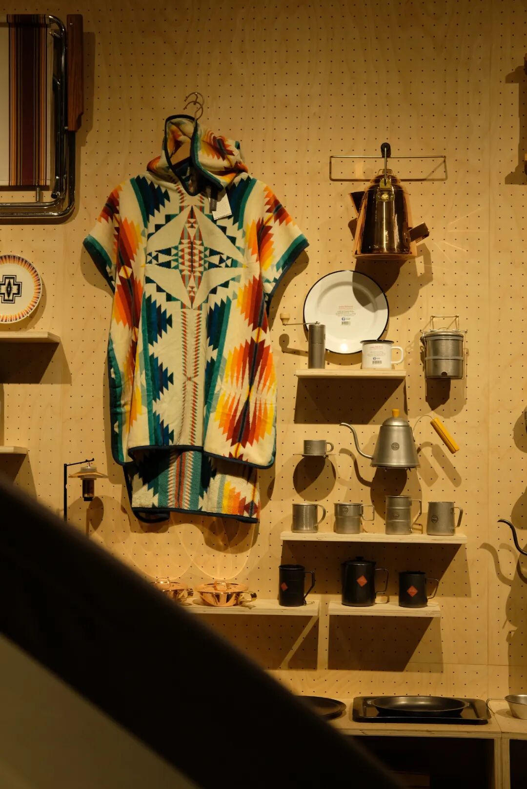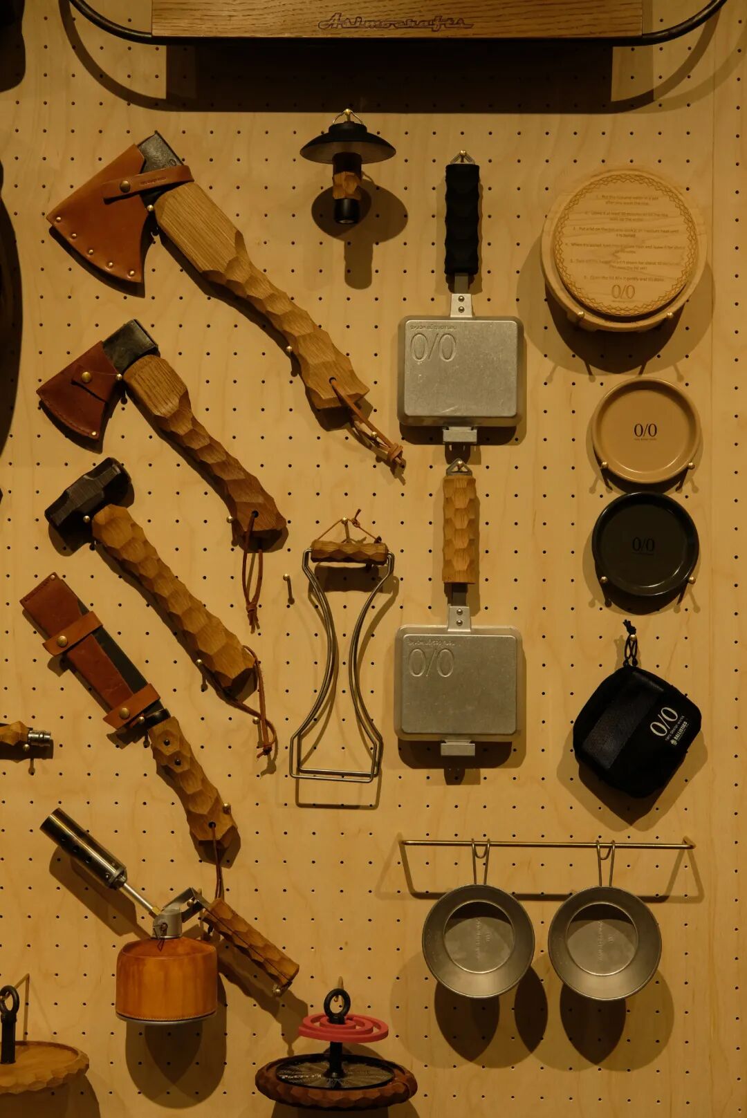 露营产品大到帐篷天幕,小到地钉勺子,多样性强,形式规格多变,货品上新速度快,需要一种灵活的陈列模式,OFF店里运用了木质洞洞板,并将此延伸为空间主元素与主色调。
