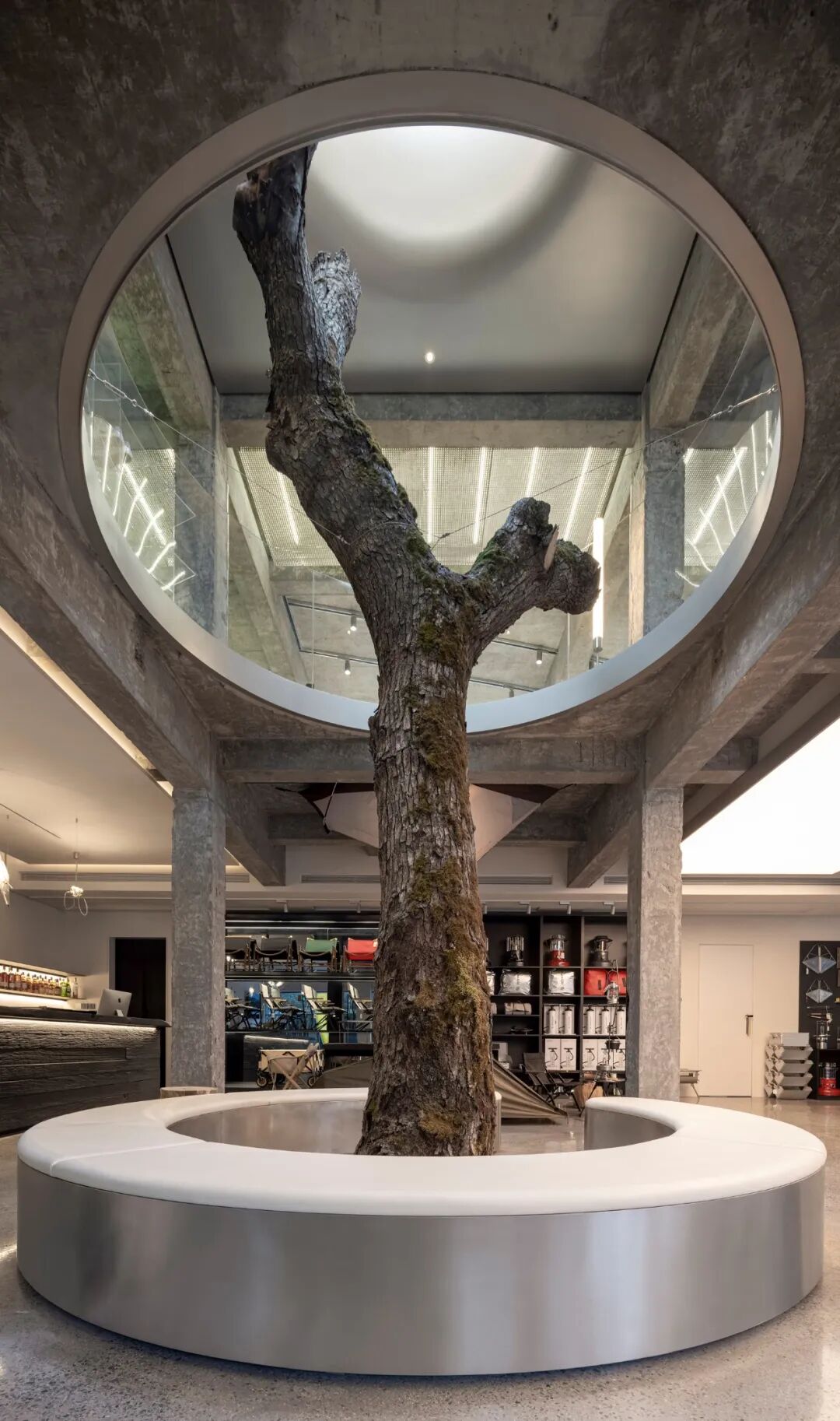 ▲探索生命的巨型树干,从一楼穿透二楼直至天空,光影在地面随着时间推移而变换。