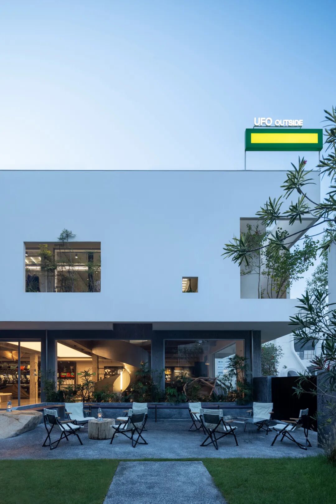 UFO由一栋两层建筑和一幢独立玻璃房组成,外加750平米的大草坪。原建筑平淡无奇,设计中围绕案名“UFO(不明飞行物)”展开,衍生出“等待起飞的UFO”概念,对建筑进行了包裹改造。