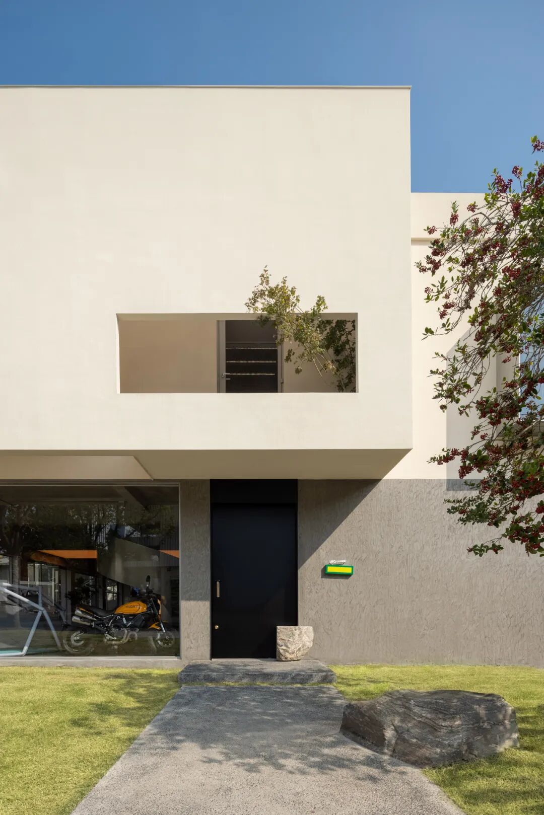 天井之一为旋转楼梯,成为一楼上至二楼的通道,不锈钢与素水泥的搭配,像极了外太空的金属感与未来感,登上楼梯仿佛正在踏上太空飞船。另一个天井开凿在对称位置,将一颗巨大的树干移植至此,从一楼穿过天井探向天空,寓意着生命的探索。