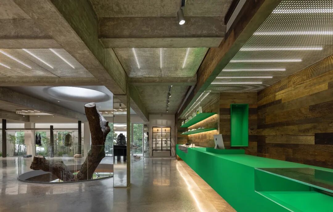 很多人都被UFO的绿色所吸引,这是UFO独有的标志色,出自著名平面设计师梅数植老师之手。闪闪的绿搭配鲜黄,既象征着户外,象征着活力,又代表着时尚。店铺设计中将该色彩提取并延伸,在空间内轻轻点缀。