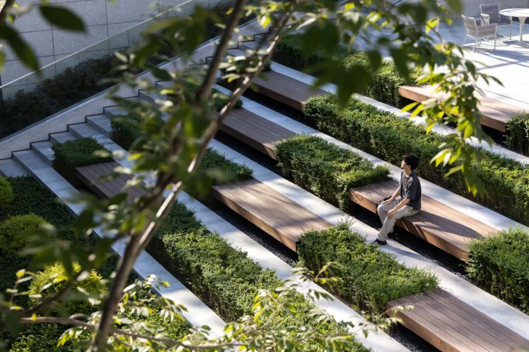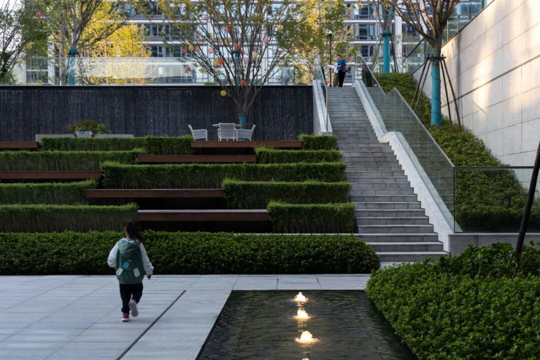 以这个大的产品定位为先导,我们在建筑天然围合的下沉空间内,借用高差、分层设计,满足不同的功能需求;置入涌动的泉水,自然的林荫,交错的木条凳、潺潺的水声.……共同营造出一个舒适不张扬的社交生活空间。