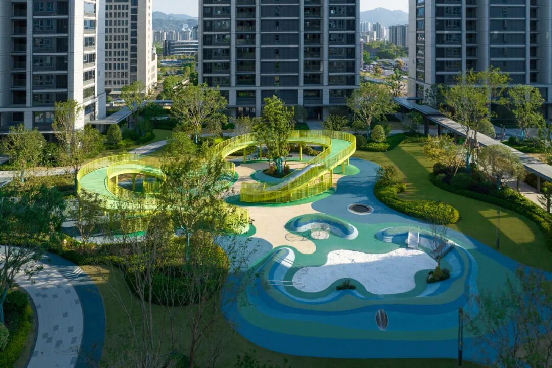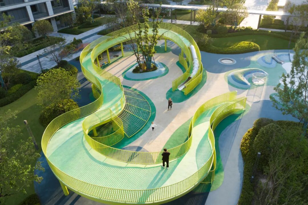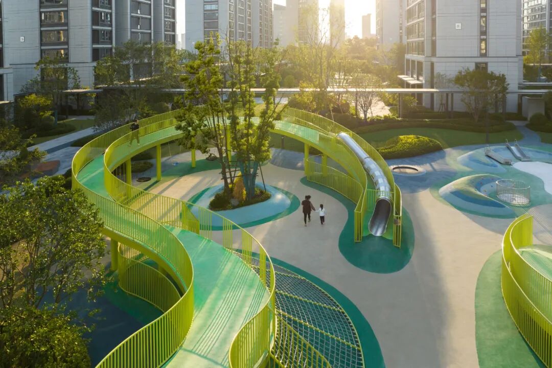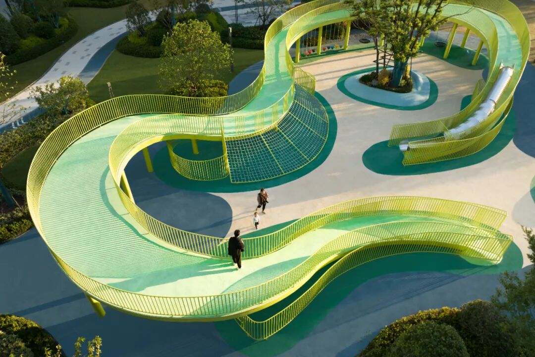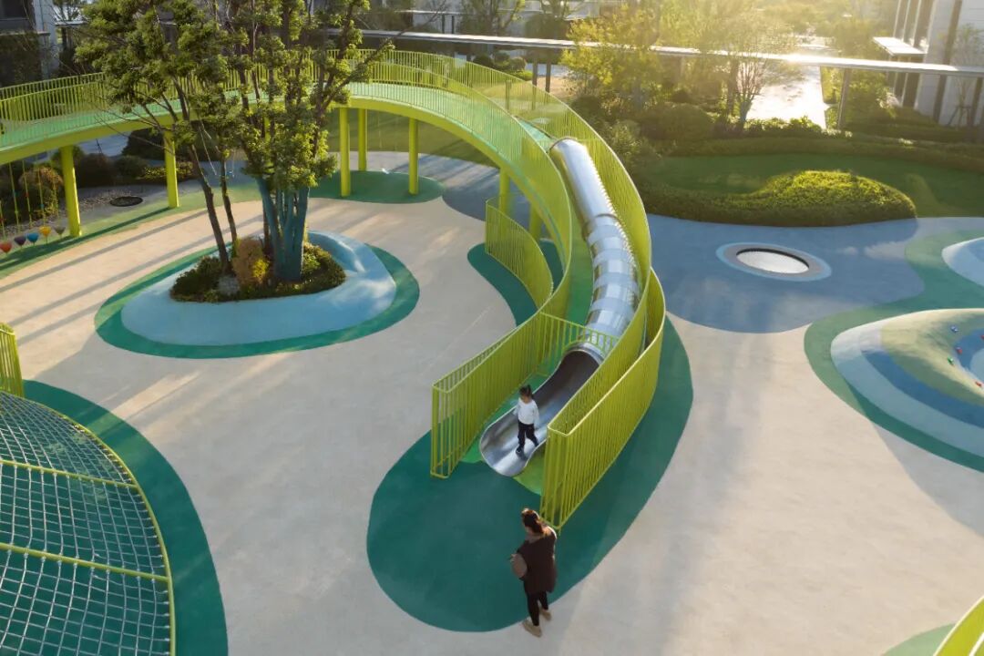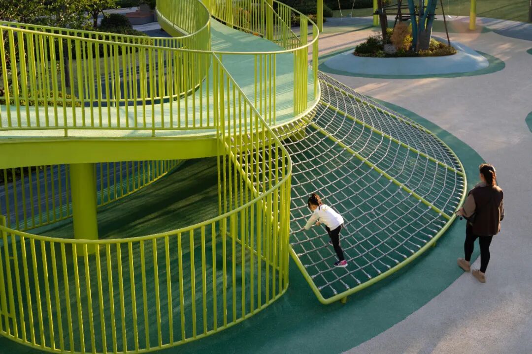 多功能桥同时将滑梯、爬网、秋千等功能集合于一体,形成极具地标感的全龄活动场地,为孩子们提供一个可以肆意跑跳、攀爬、玩耍的户外成长空间;西北角为低龄区域,沙坑、滑梯、攀爬、蹦床等,充分满足了小朋友们对于世界的初始探索与好奇;无障碍设计以及栏杆防护、圆角防磕碰等细节处理,也让家人更安心。