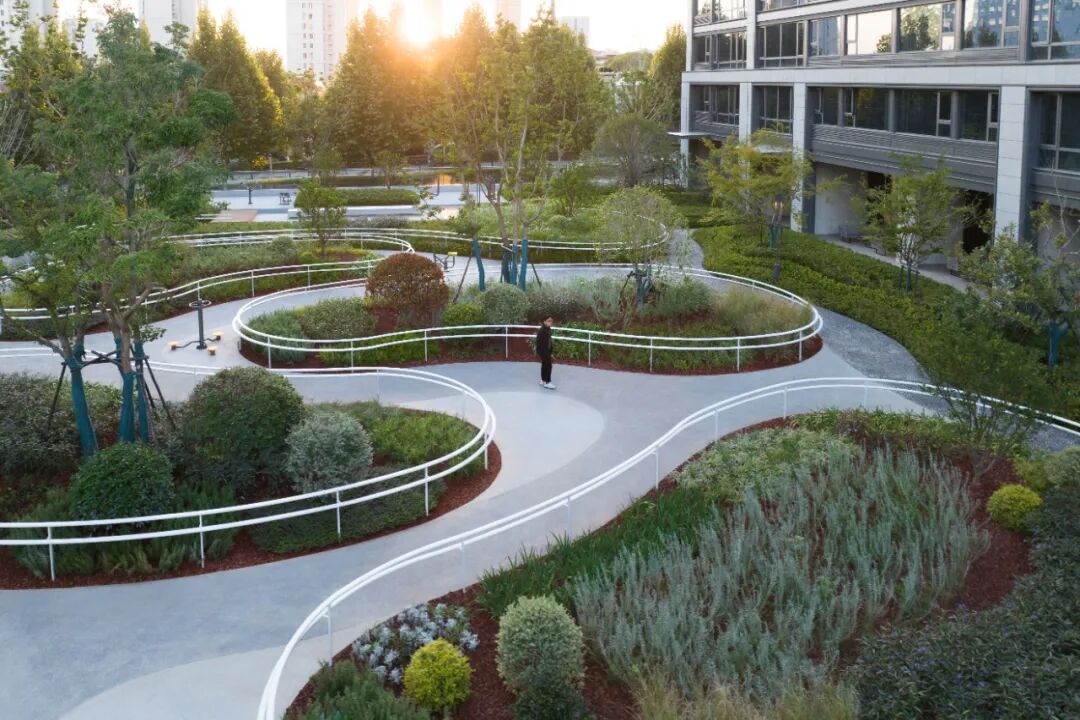 伴随社会老龄化的加剧,如何让社区对老年人更加友好,也是需要不断深入思考和实践的课题。我们在东西向轴线的端头,营造了一个近2000㎡的适老疗愈花园。