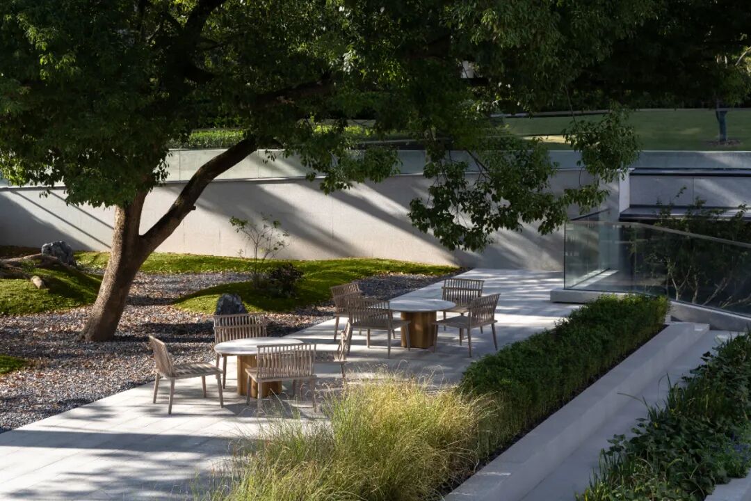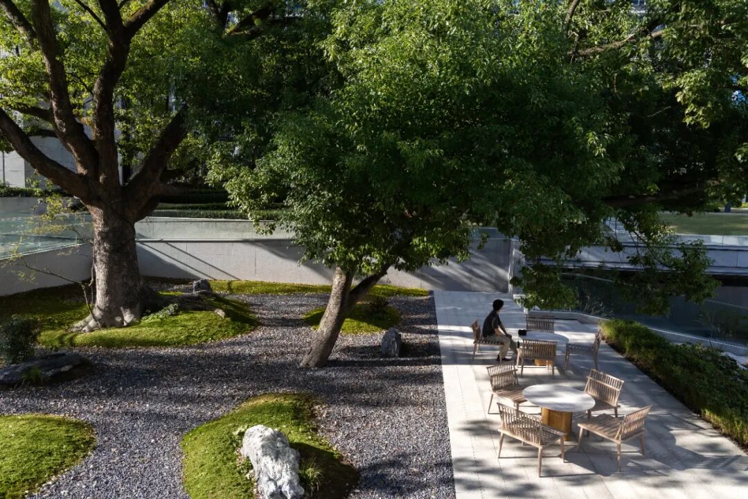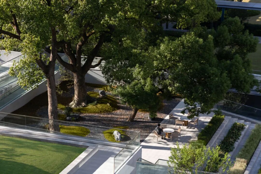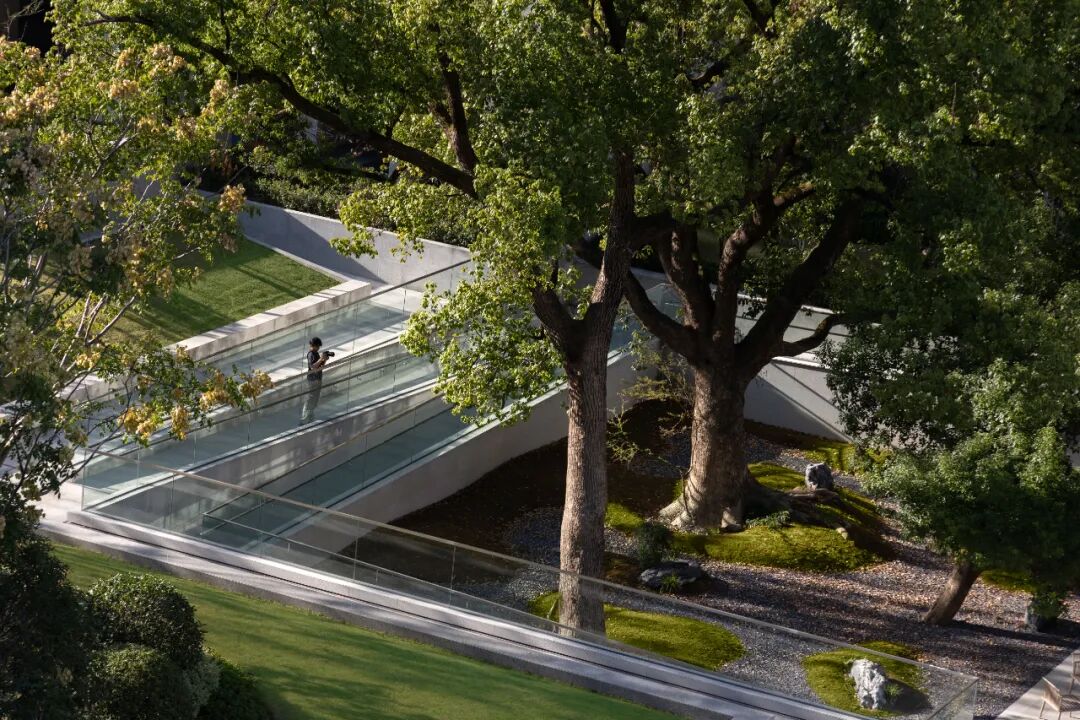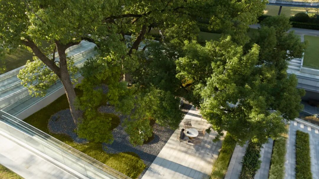 接下来,就是怎么样能够在保护的基础上,尽可能多角度的让人与树产生关联:包括观赏、停留、引导、陪伴.……等等。古树树根的位置介于园区和地库标高之间,无论单纯从地上还是地下,都无法看到全貌,于是我们产生了一个大胆的想法:把古树庭院作为一个媒介,连通地上与地下;对于地库,打开的庭院可以增加采光,同时引入自然对景,弱化封闭感;对于地上,结合竖向的处理,形成不同的观赏层次和角度,营造林荫休憩平台,落地春知学堂,丰富园区的体验。