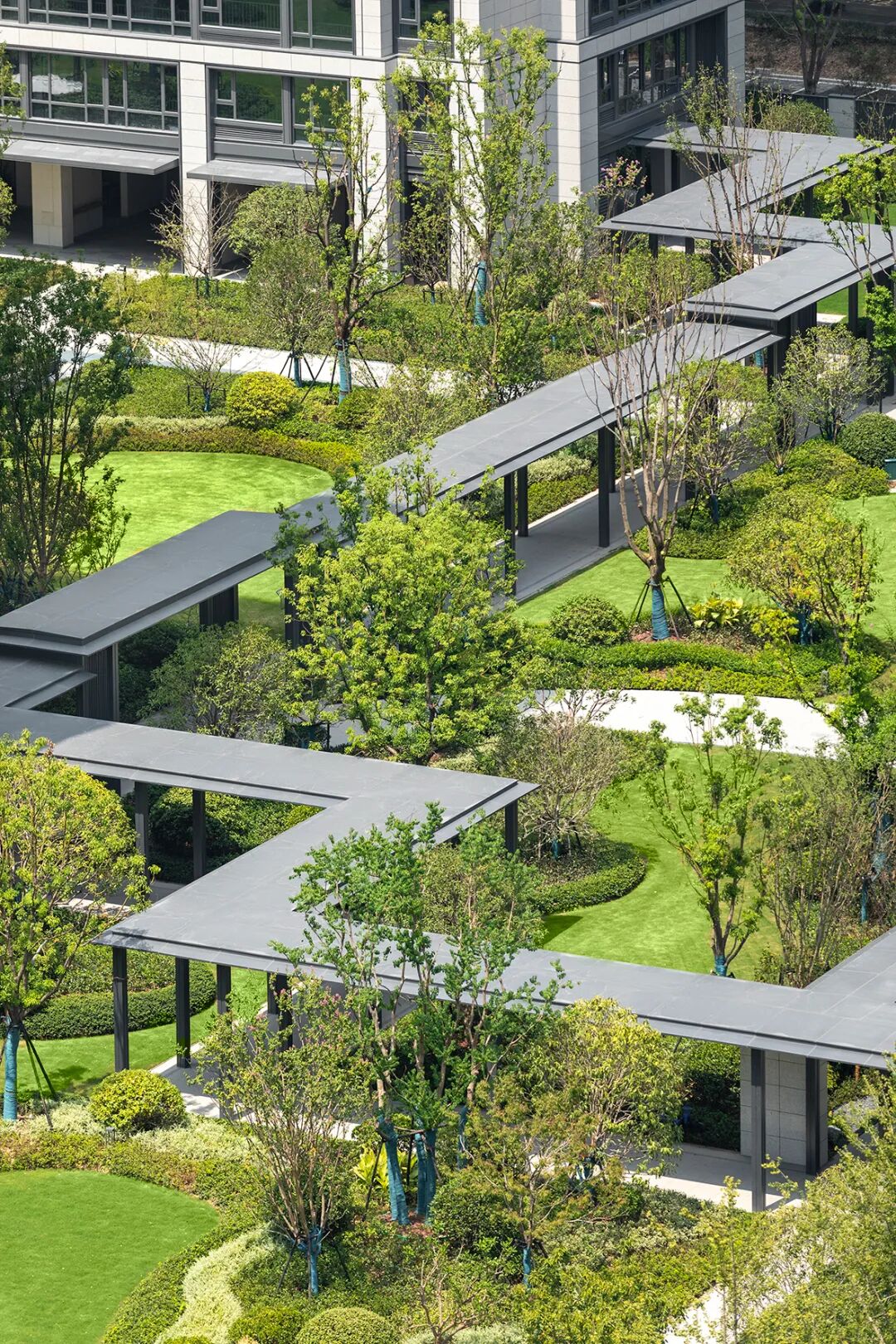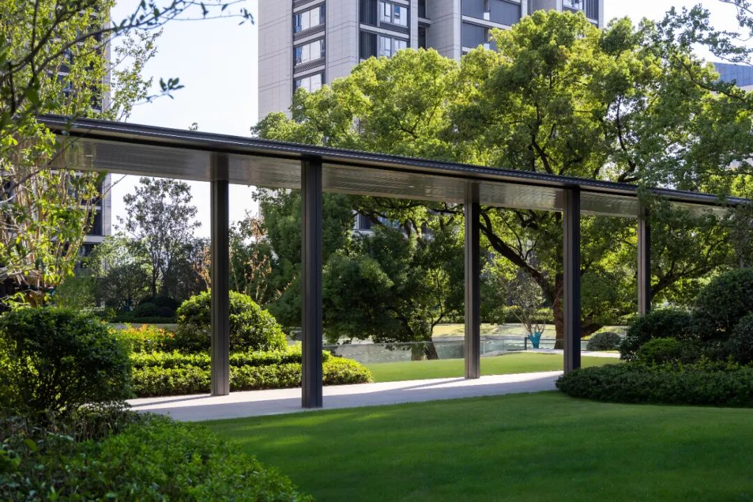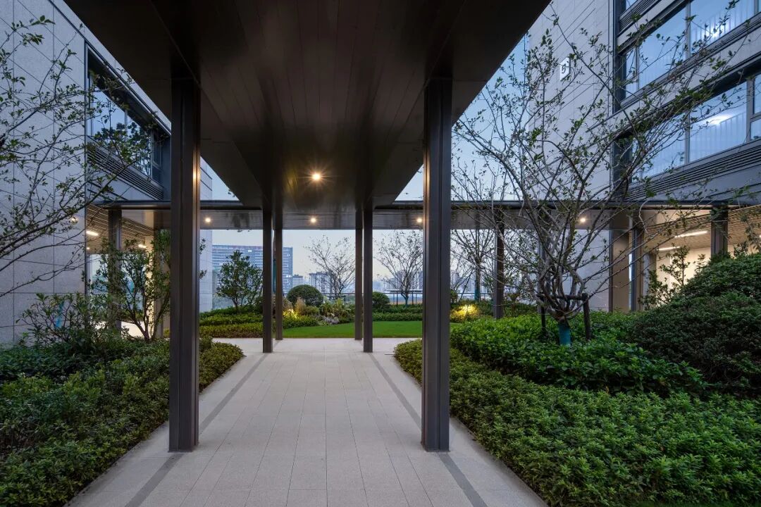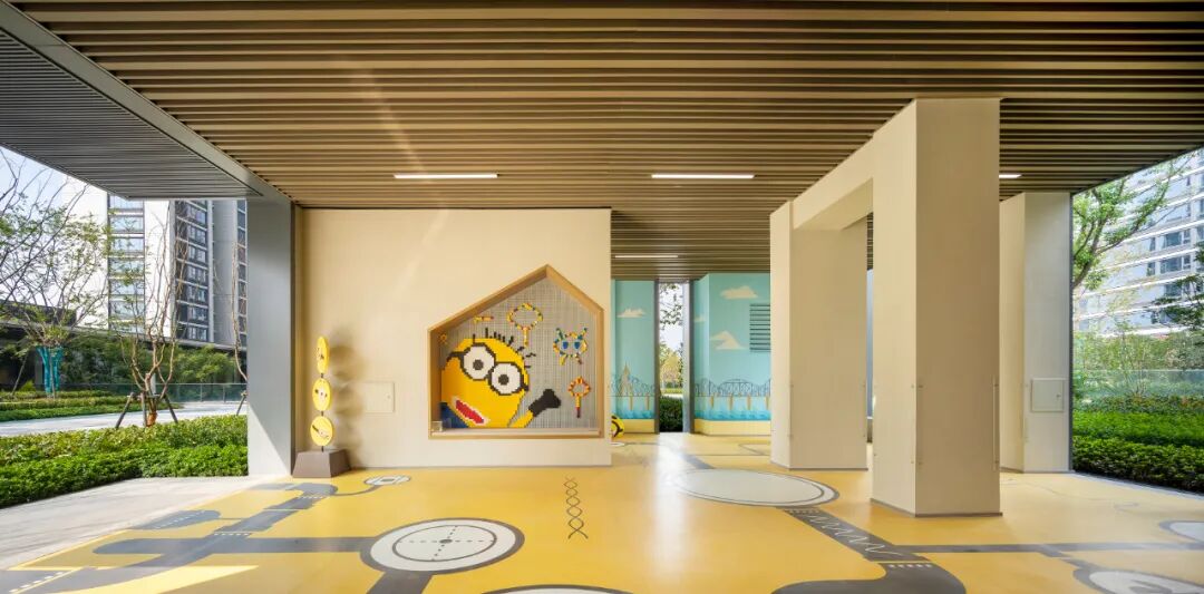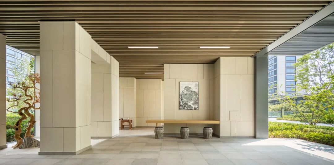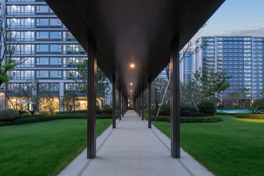 架空层,在设计过程中,我们尝试向内引入自然,向外延展功能,精细对位建筑雨棚轮廓及立面划分,营造兼顾观赏性和实用性的一体化首层社区生活空间。