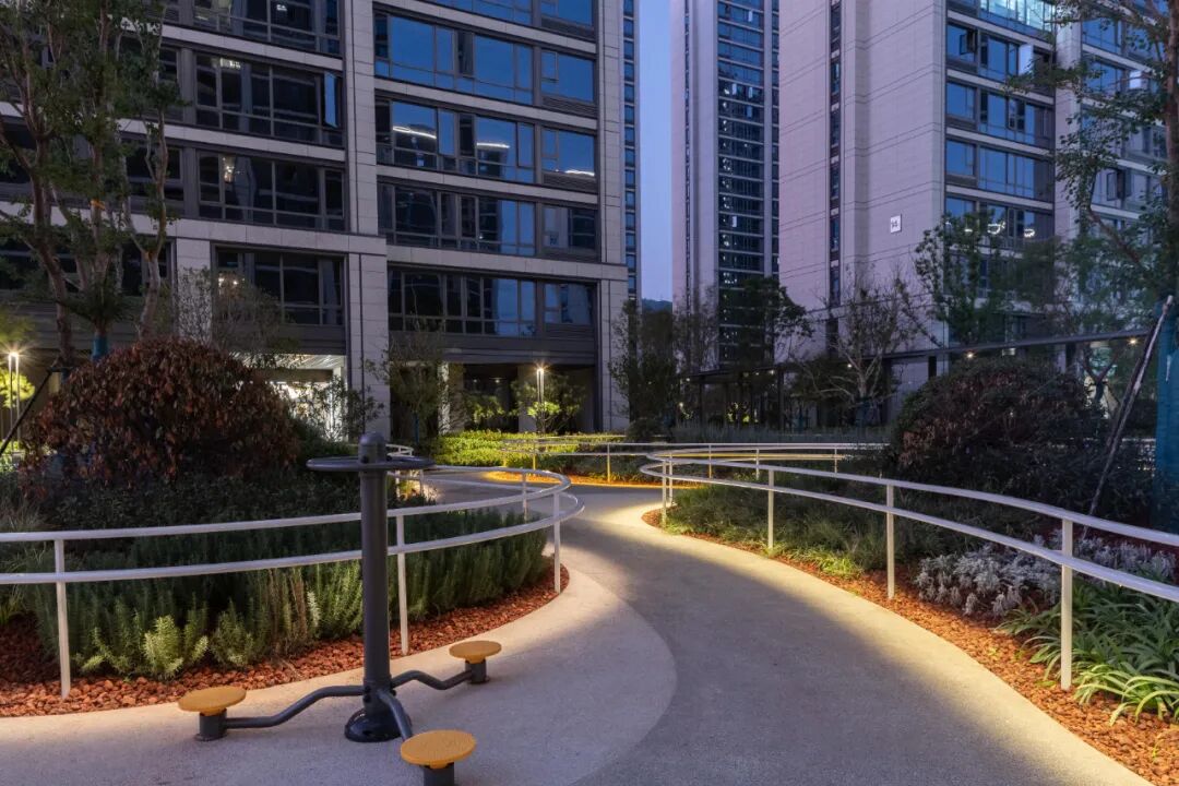 环绕着5个相互交错的绿岛,设计了高低微起伏的立砌卵石步道;坐凳休憩区和健身器械区的布置,以及不同高度的扶手栏杆设计,也充分满足了不同老人的生理需求。