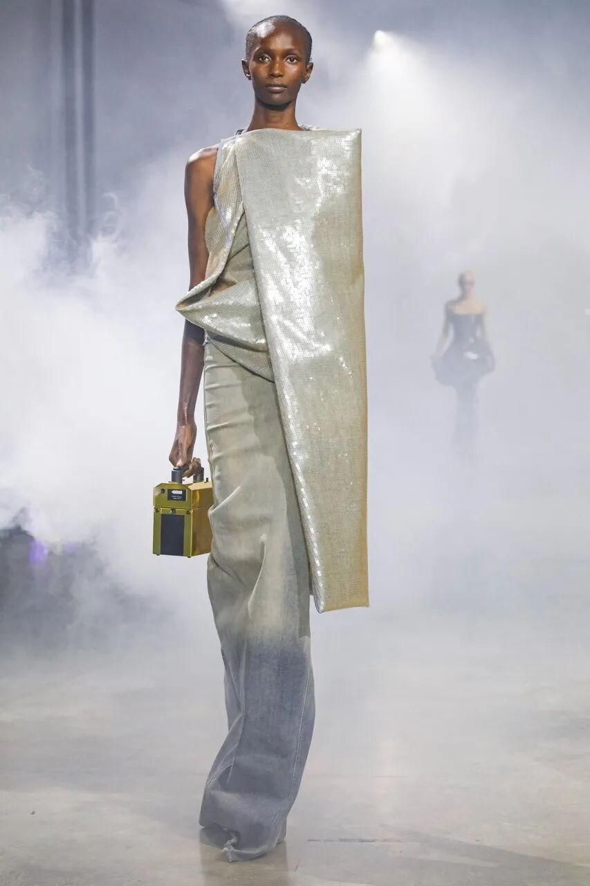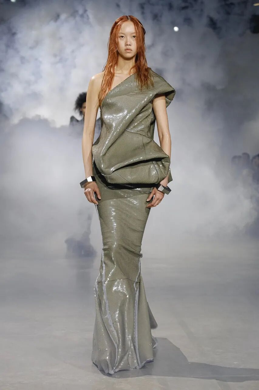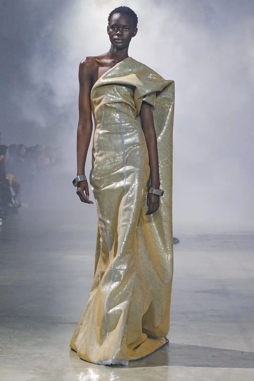 电影导演 Cecil B.DeMille 在那个无声电影的时代塑造了 Rick Owens 的审美观。模特们穿着雕塑般的银色长袍,引人注目的斗篷披在亮片连衣裙上,袖子拖在地上的羽绒外套。