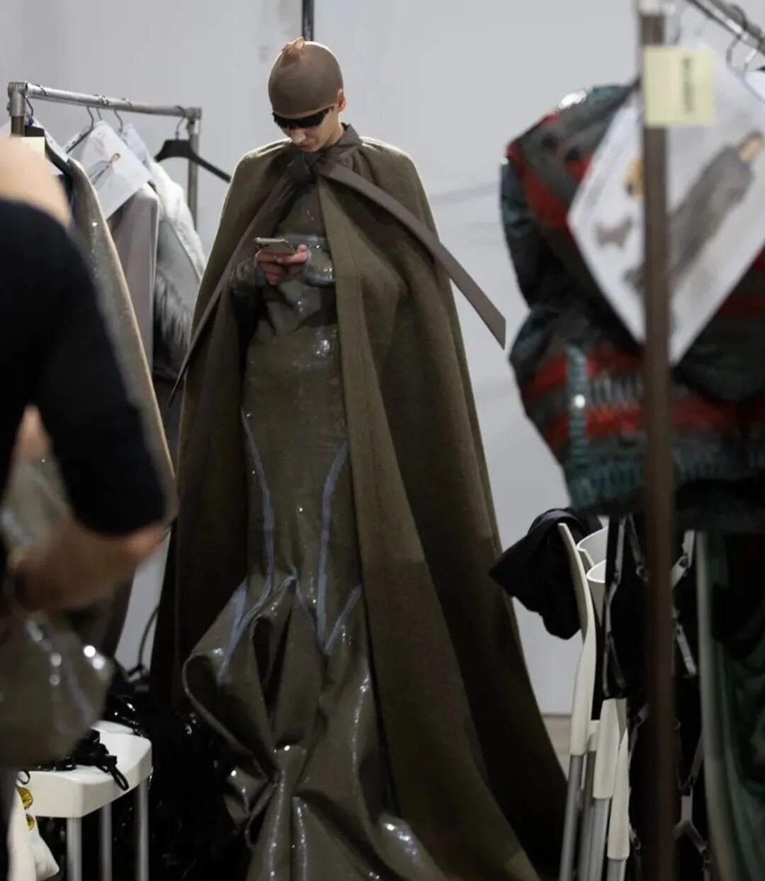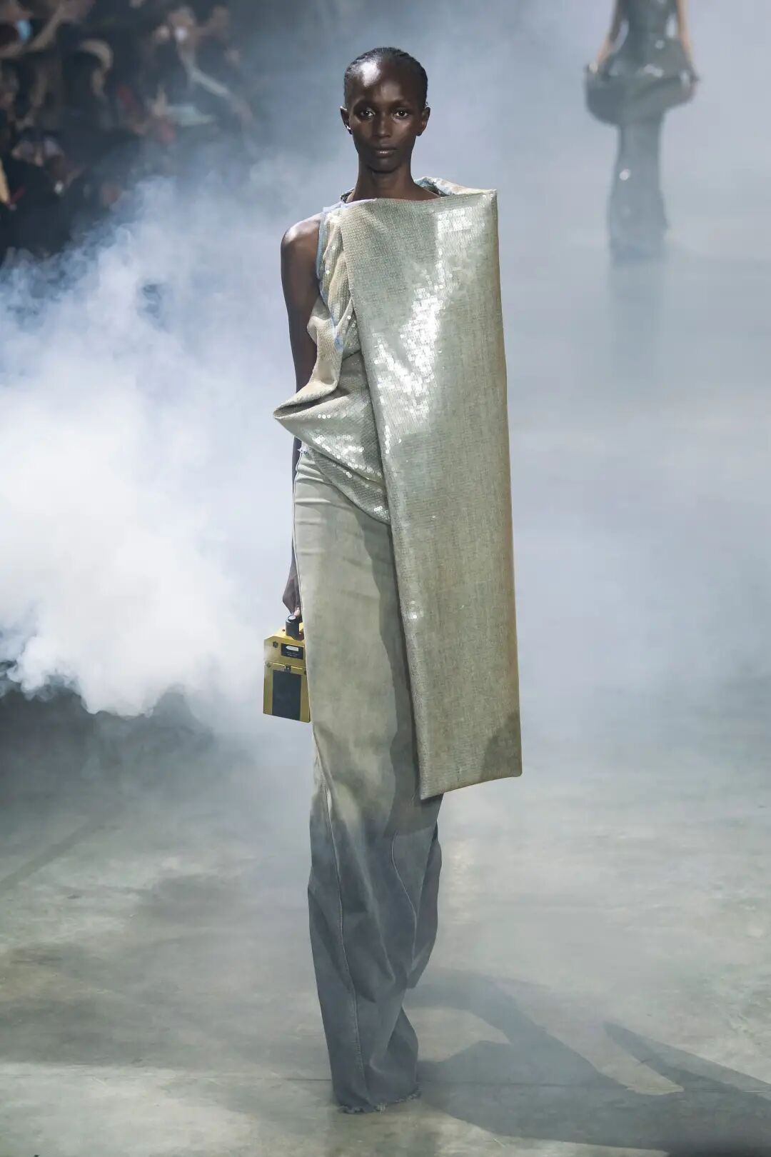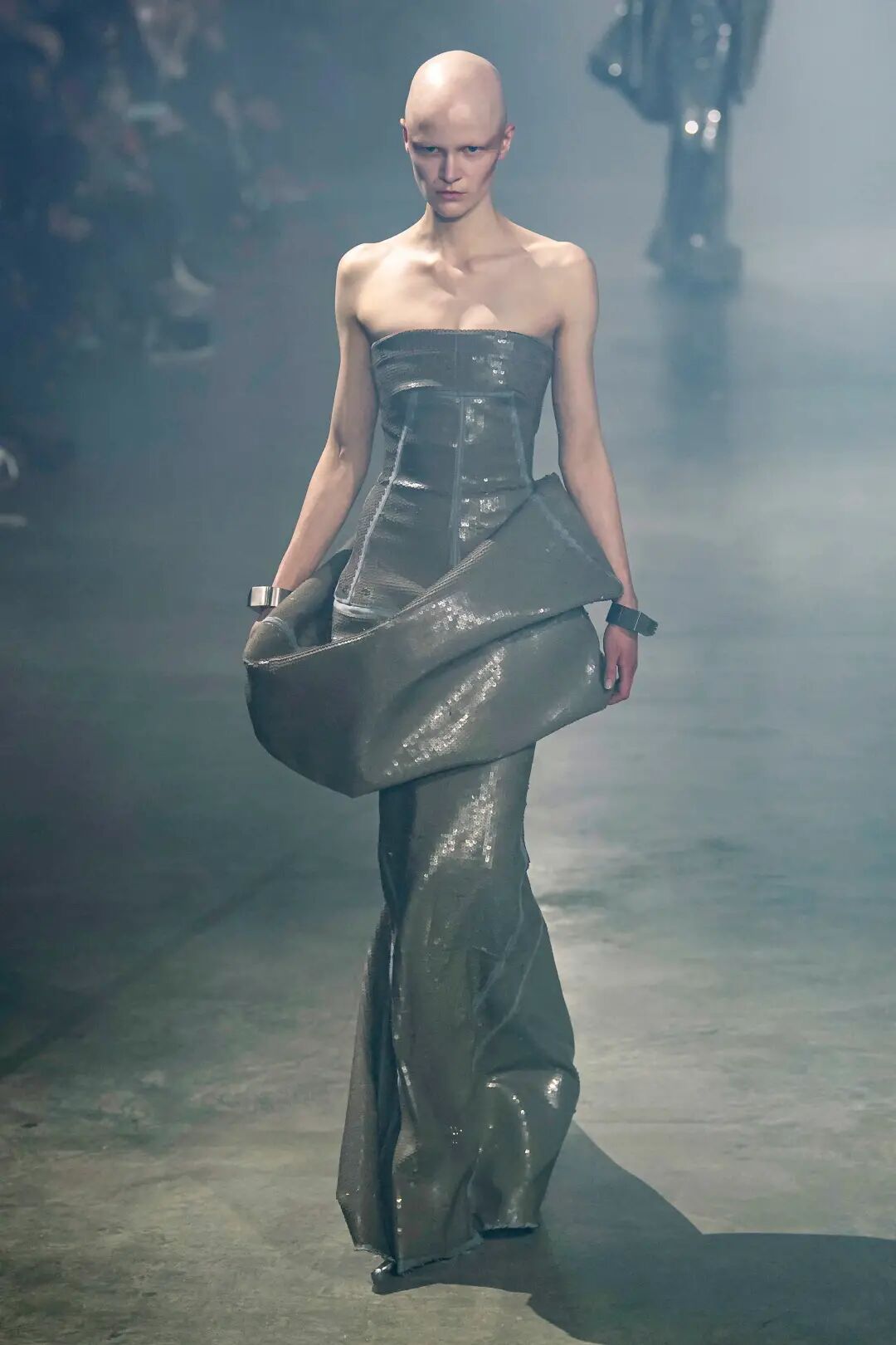 电影导演 Cecil B.DeMille 在那个无声电影的时代塑造了 Rick Owens 的审美观。模特们穿着雕塑般的银色长袍,引人注目的斗篷披在亮片连衣裙上,袖子拖在地上的羽绒外套。