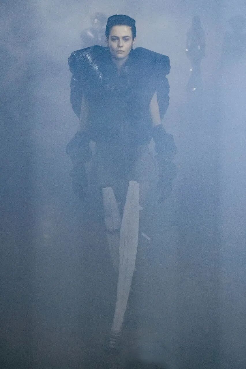 本系列依旧延续品牌不规则剪裁与暗黑设计风格,模特身着黑色天鹅绒立柱连衣裙、散发旧时好莱坞魅力的银色礼服和带有拖尾的笨重羽绒夹克,仿佛置身于暗黑童话世界。