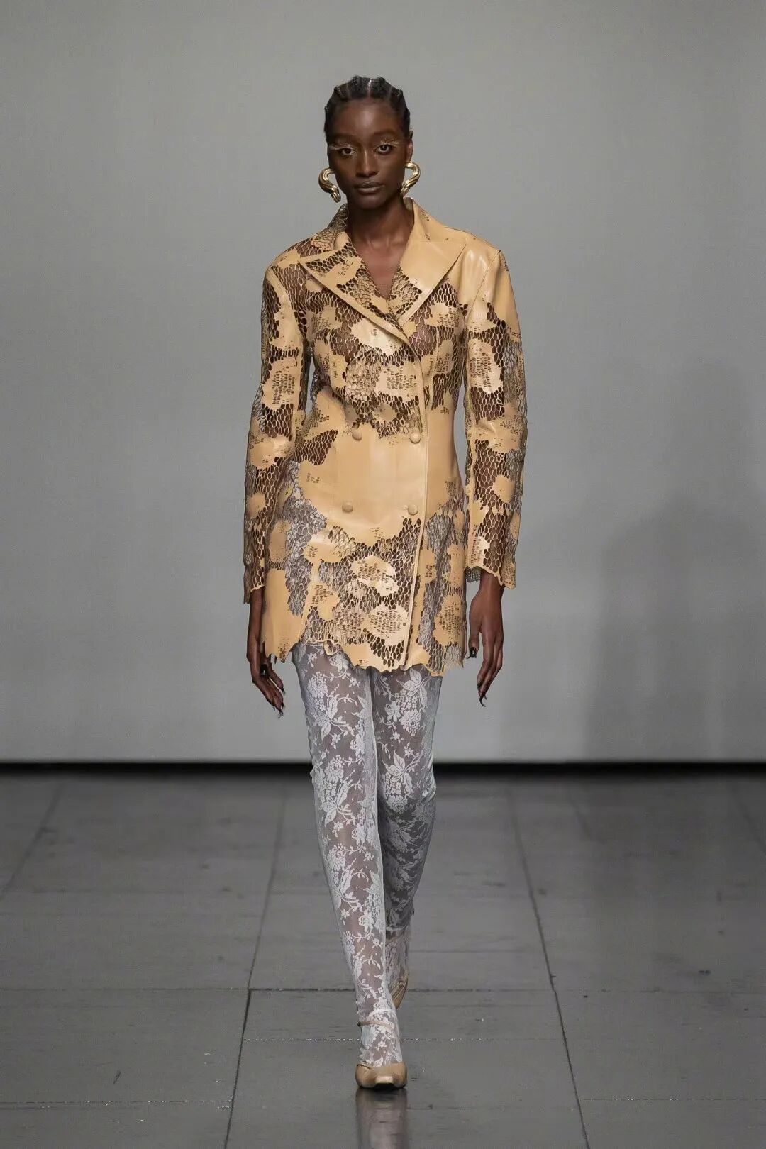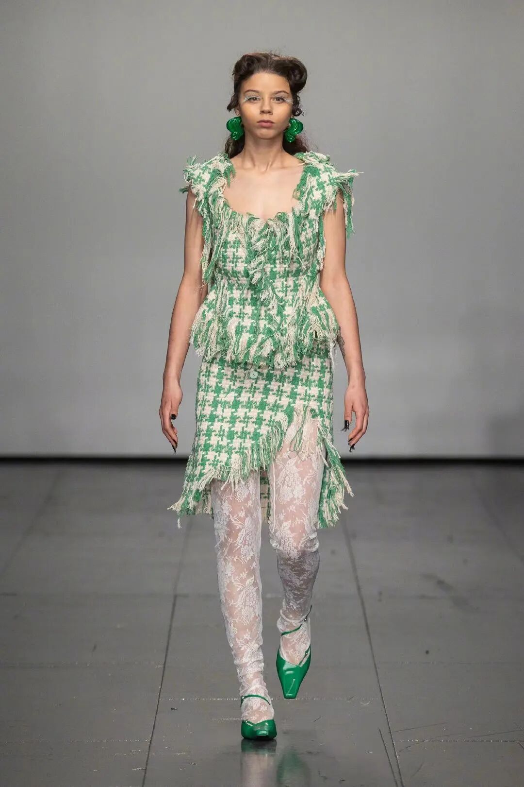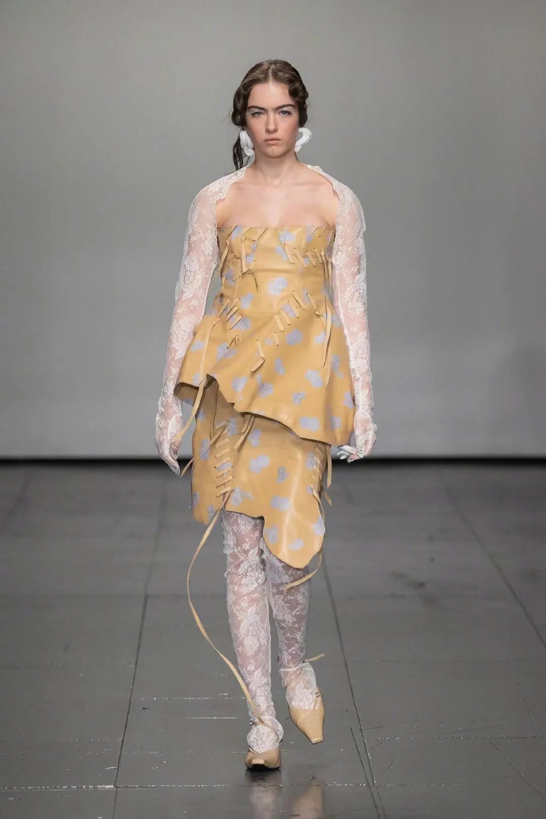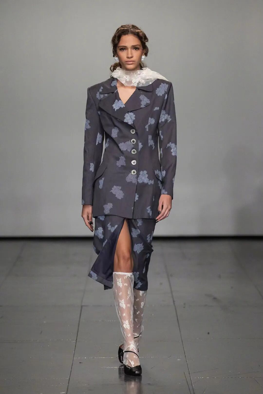 女神在新时代的语境下不再是高高在上的完美化身,设计师王予涵将浪漫的提花元素与蕾丝布料相结合,用拼贴与挖空设计,呈现“不完美之美”。