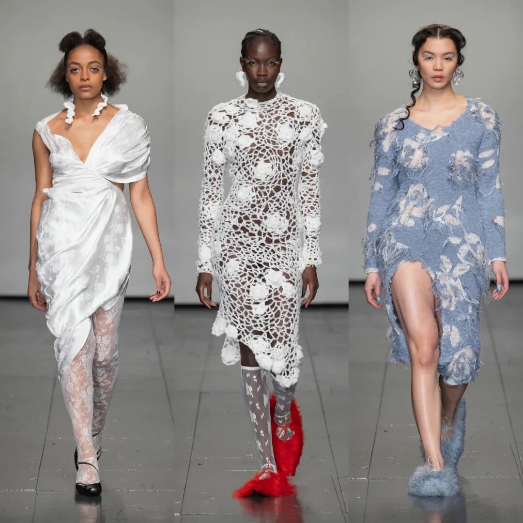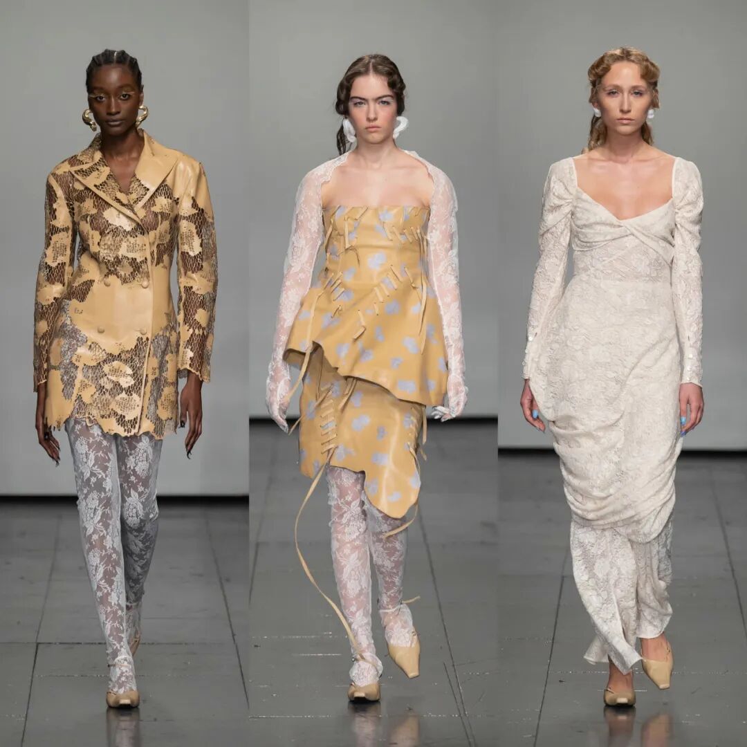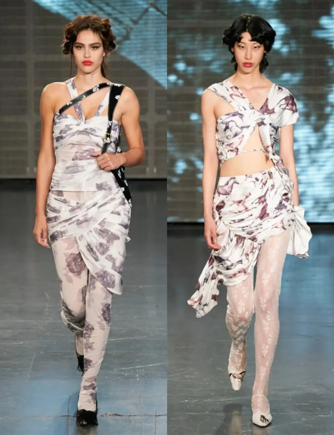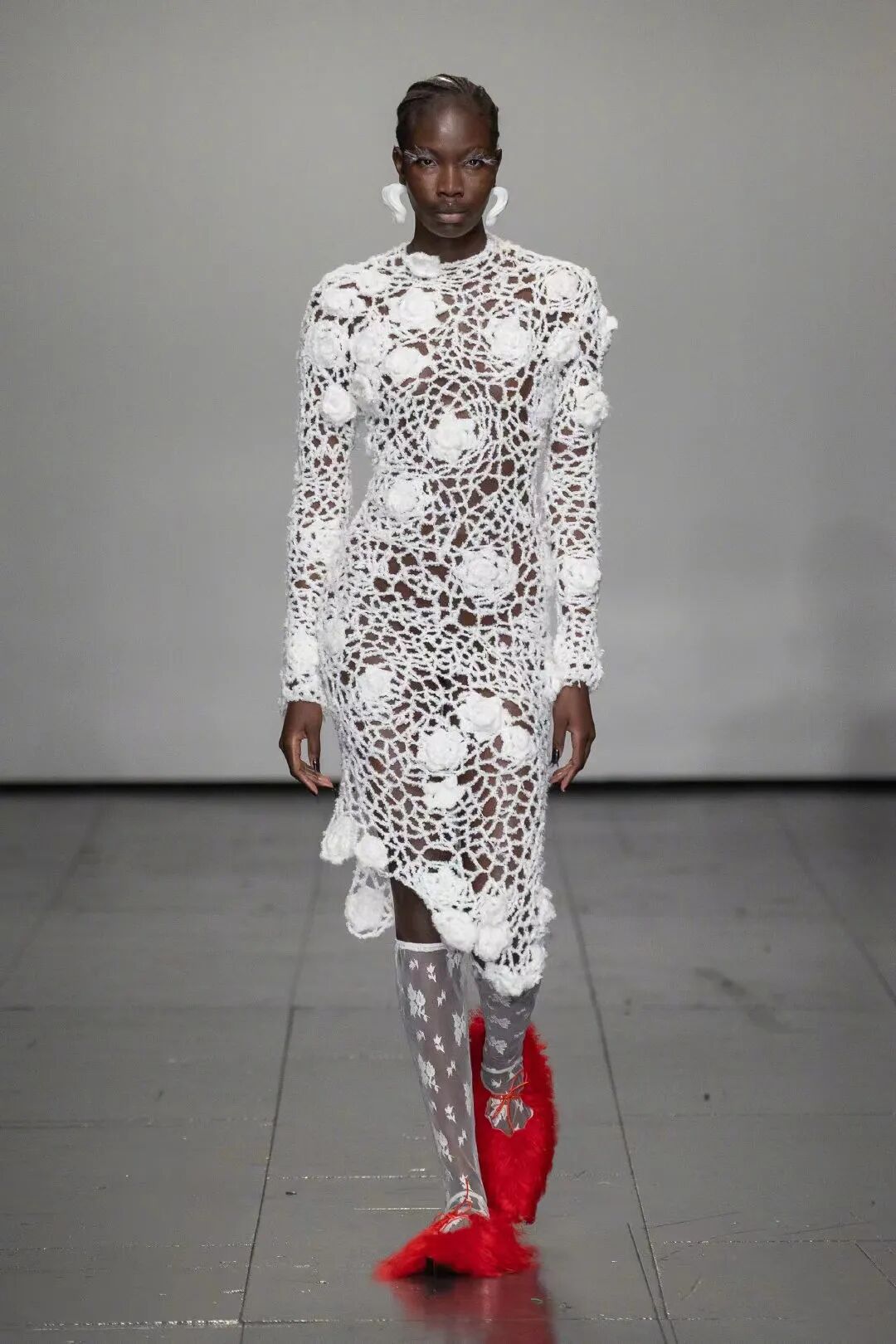女神在新时代的语境下不再是高高在上的完美化身,设计师王予涵将浪漫的提花元素与蕾丝布料相结合,用拼贴与挖空设计,呈现“不完美之美”。
