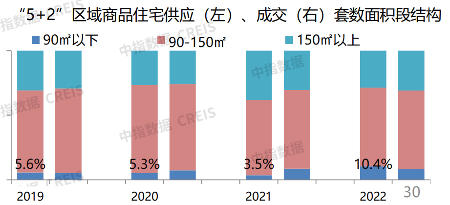 中指院的数据也显示,主城5+2区域90㎡以下户型供应占比,从2021年的3.5%大幅增加至10.4%;成交占比则与2021年持平,较2019、2020年有所上涨,显示刚性需求强劲。