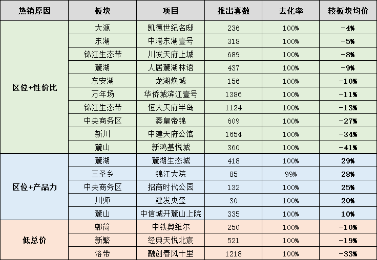 1、核心区位+性价比。如恒大天府半岛、中建天府公馆、新鸿基悦城、秦皇帝锦等网红项目,不仅区位极佳,且因为限价原因,它们的价格比均价低13-41%,去化率自然惊人;