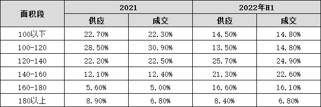 从下表可以看出,今年上半年140㎡以下产品成交占比仍达54.5%,且120㎡以下的小面积段产品需求高于供应。