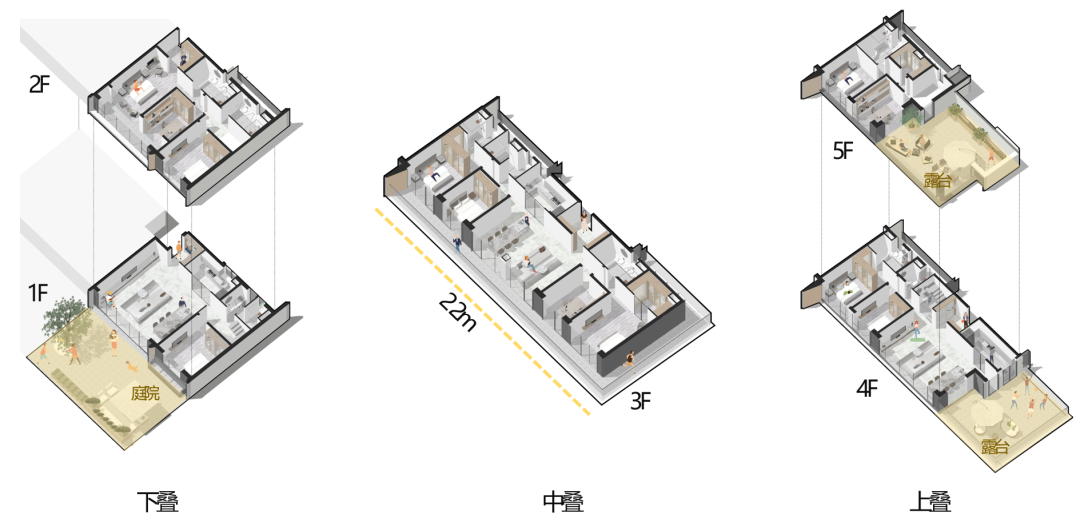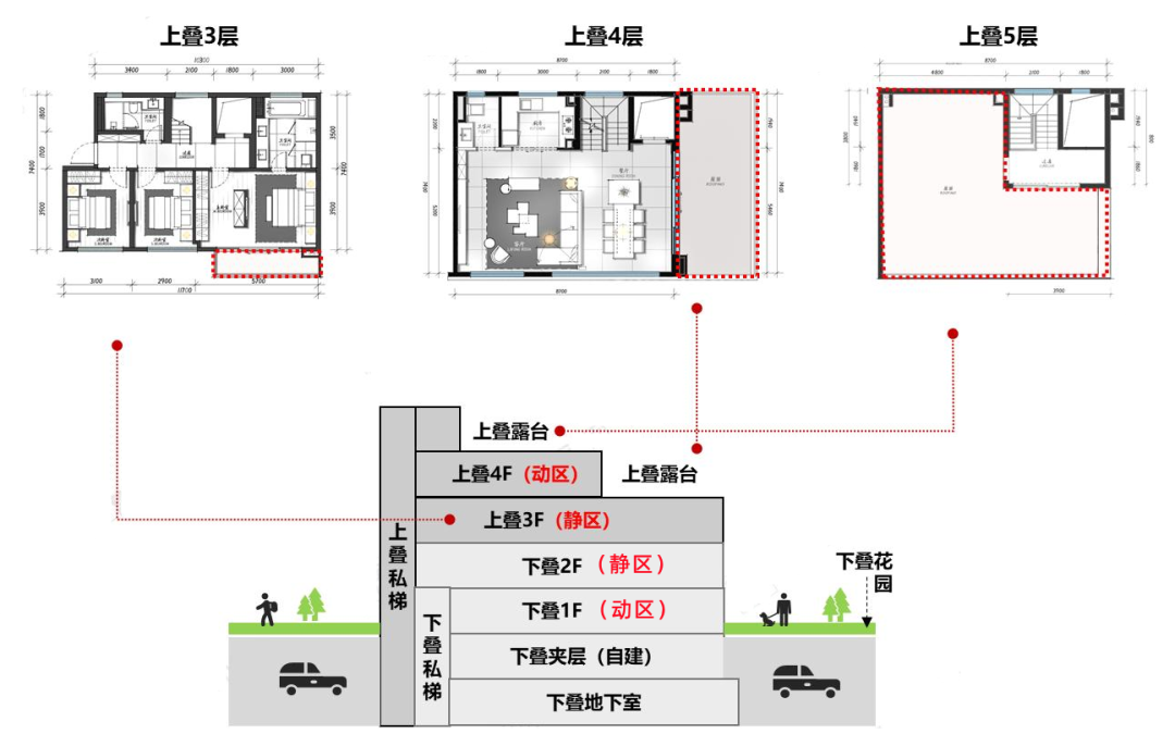 也有项目为解决中叠资源欠缺,将中叠从竖向调整为横向,延展为大平层产品;或将两个相邻上叠连通,营造更大的空间尺度。