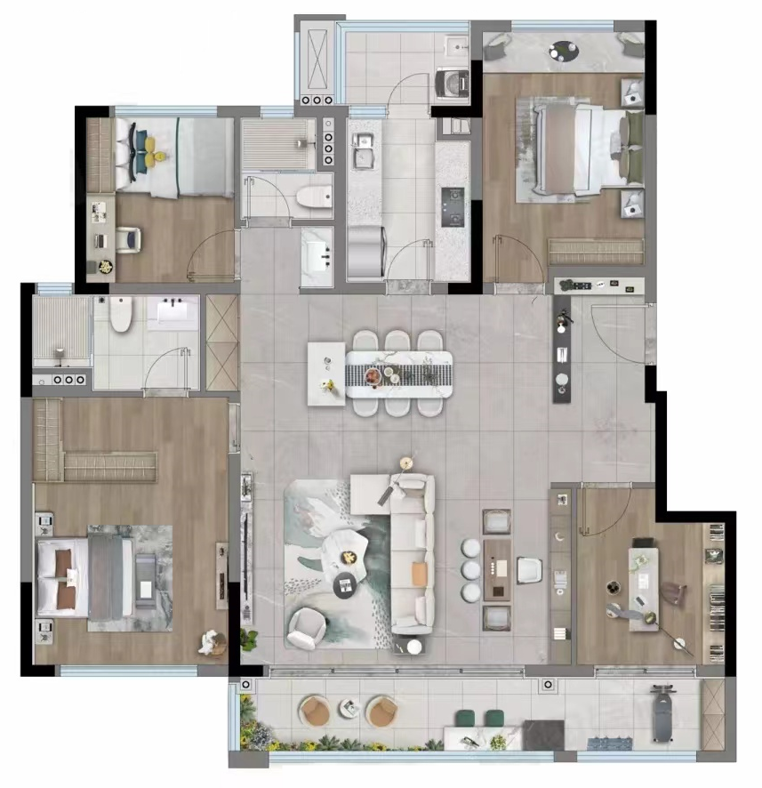麓湖观澜,客餐厅、西厨岛台,加上270°的景观阳台和可全开放的书房,形成近100㎡的LDKBS社交生活场,兼顾了景观和功能性。