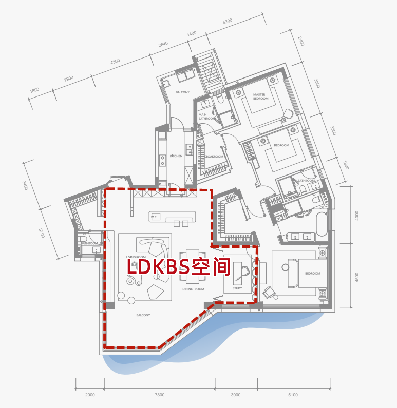 麓湖观澜,客餐厅、西厨岛台,加上270°的景观阳台和可全开放的书房,形成近100㎡的LDKBS社交生活场,兼顾了景观和功能性。