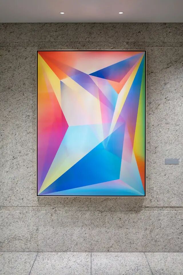 体现科技感的任务,落在了荷兰艺术家Rafael Rosendal的作品之上。粗一看这件作品,颇有奥普艺术的风格,玩转你的视觉感知。但触碰之下,你会发现其图案随角度而变化,是这幢大厦里难得的互动型艺术装置。
