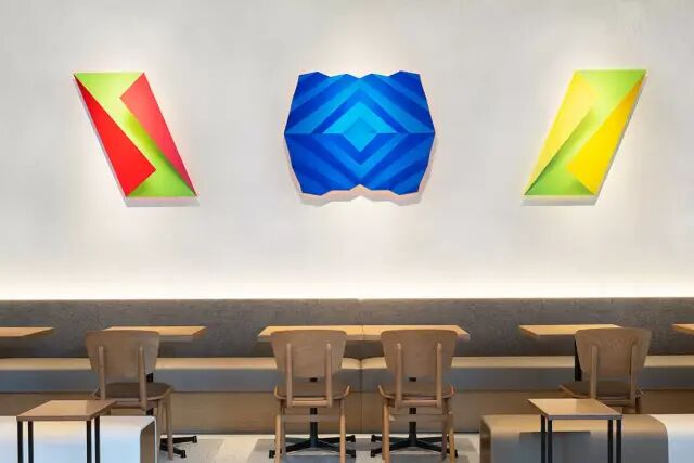 位于三楼的食堂,白天专供职员使用,晚上开放给公众进入,但无论白天还是晚上,艺术家吉野もも的“Kami”系列作品都会在那儿等你欣赏。使用鲜艳的色彩,并结合透视法与错视技巧,在平面的空间上表现出了立体的视觉效果。