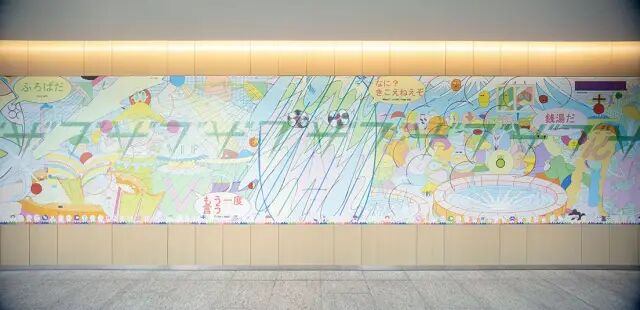 上到一楼,又是一件大型的公共艺术作品。充满童趣的笔触,软化了摩天大楼冰冷坚硬的形象。因为常盘桥被认为是日本浴室文化的发源地,因此横山雄一以浴室为灵感来源创作了这幅作品。