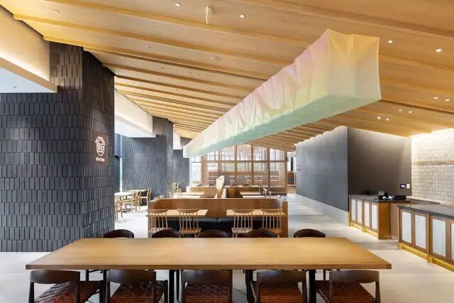 森山茜(Akane Moriyama)的作品高悬在餐厅的上方,这件名为《光谱》的布料软雕塑呈现出蓝色、黄色和橙色的渐变感,但雕塑内部并没有设置发光体,完全靠反射外部光线和环境光线发出微弱的光。呈现出这样美丽的颜色,也并不是依靠科技的手段,而是通过与京都的染色工匠合作,用古老的技艺呈现出完美的效果。