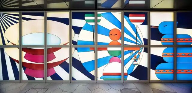 说完了餐厅的艺术品,我们再看看这幢大厦里的其它艺术品。打一进门,我们就能看到日本艺术工作室KIGI的作品。这件作品名叫《マワレ!セカイ》,以江户陀螺(江戸独楽)为创作灵感,加上超扁平的画风,感受到了浓郁日式风情。