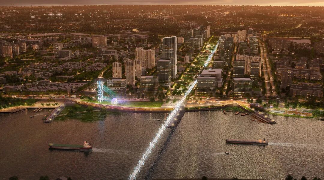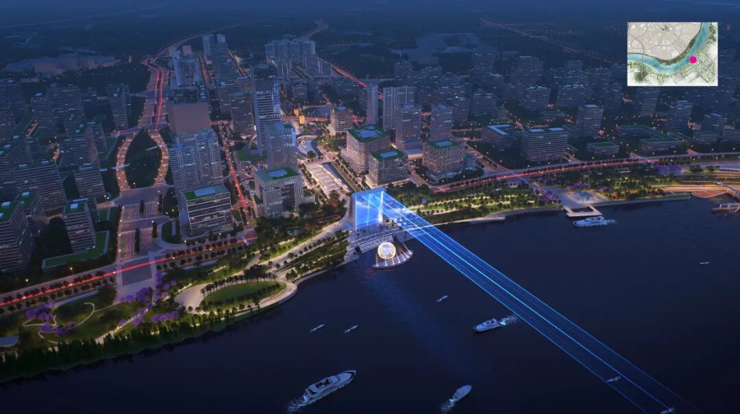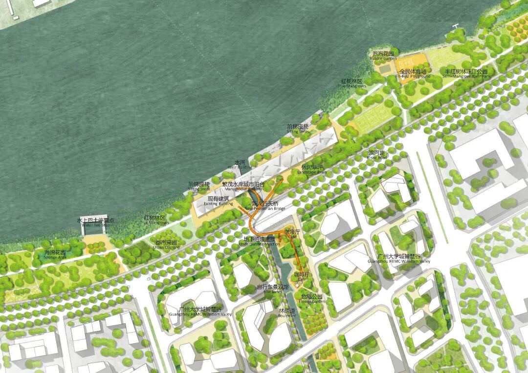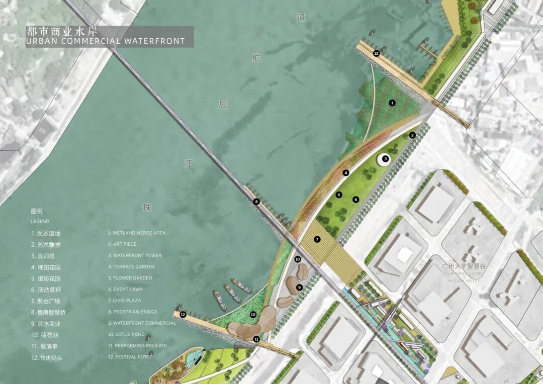 滨江示范段都市商业水岸,位于科技轴线和自然轴线的交汇,为加强智慧科技谷和广州大学城的连接,设计方案规划建立一座“番禺智慧”慢行桥。这里有活动草坪,节庆码头,轮渡渡口,滨水商业等,为步行、骑行、游船的人们提供了重要的停留空间,吸引科技人才和支持城市青年的多样活动。