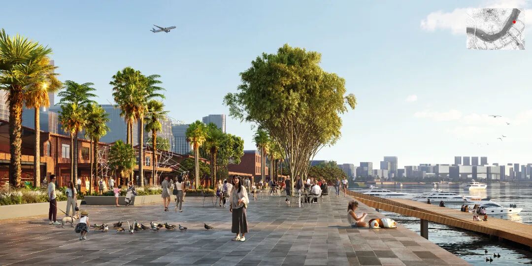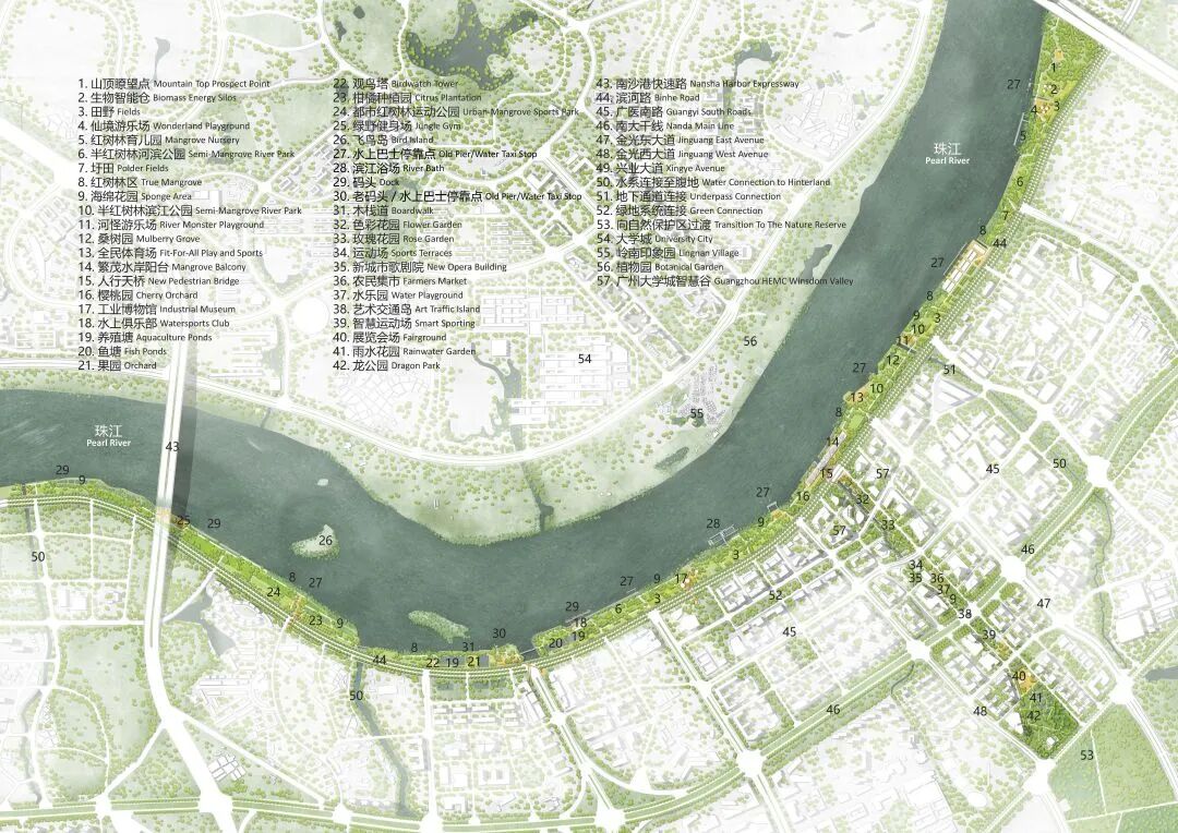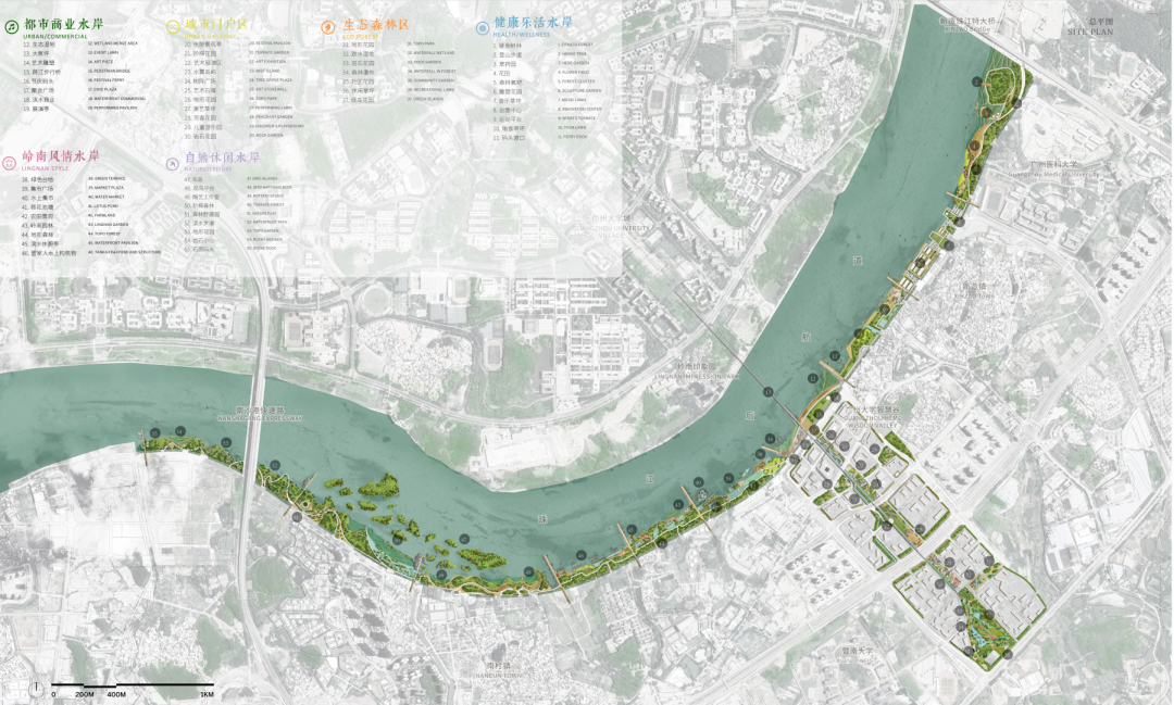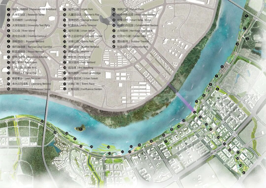 具有强烈滨江特色的设计方案旨在建立一个有弹性、多样化的生态基础设施,传承岭南文化,保护和再利用工业遗产,提供丰富的户外设施,来创造一个具有现代岭南特色的开放的交流协作平台。设计方案结合规划用地性质,将滨江绿带划分为七个景观区,分别为自然体验探索区、水上娱乐休闲区,滨河社区公园区,国际会议区,中轴门户会展区,新造良仓湿地区及大学科研实验区。保留该地区的工业遗产及其适应性再利用是整体创新滨江设计的核心。现有工业建筑遗存被因地制宜地改造为不同的设施,比如承担河流修复新引擎功能的季节性湿地公园,油罐建筑改造的会议中心等。新的社区公园提供多样的儿童游乐及康体健身功能,倡导高质量的亲子活动及健康的生活方式。