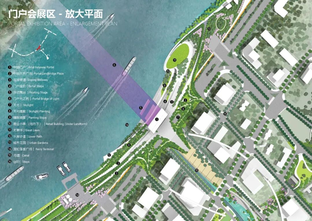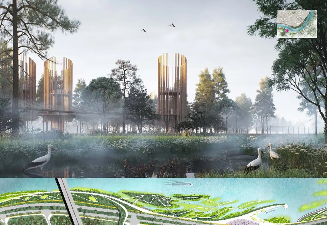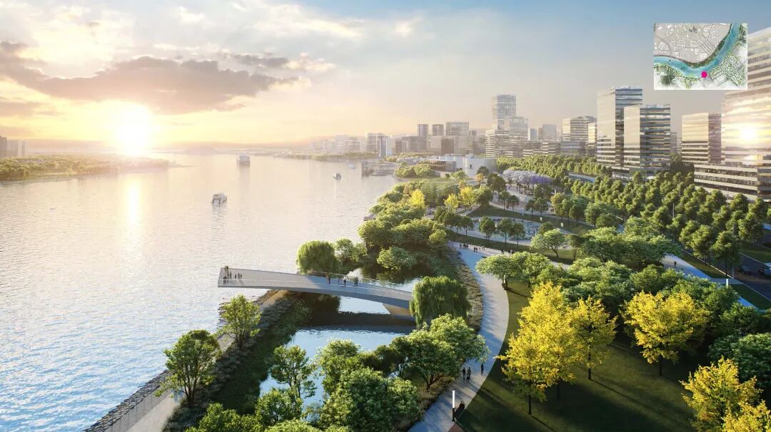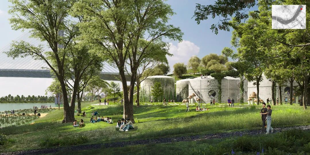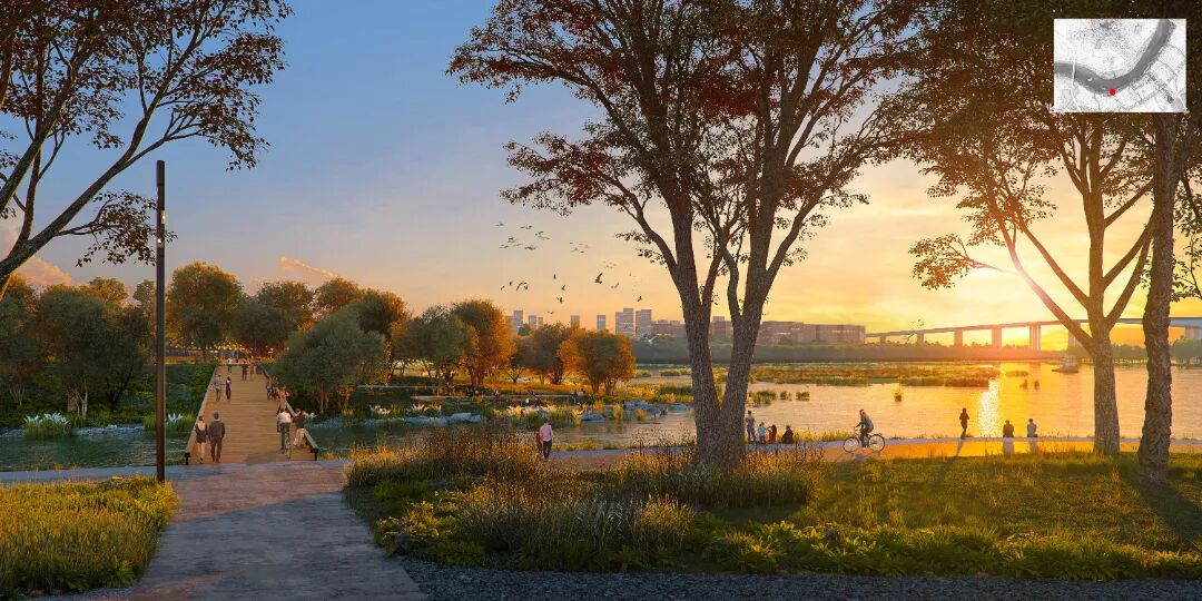 具有强烈滨江特色的设计方案旨在建立一个有弹性、多样化的生态基础设施,传承岭南文化,保护和再利用工业遗产,提供丰富的户外设施,来创造一个具有现代岭南特色的开放的交流协作平台。设计方案结合规划用地性质,将滨江绿带划分为七个景观区,分别为自然体验探索区、水上娱乐休闲区,滨河社区公园区,国际会议区,中轴门户会展区,新造良仓湿地区及大学科研实验区。保留该地区的工业遗产及其适应性再利用是整体创新滨江设计的核心。现有工业建筑遗存被因地制宜地改造为不同的设施,比如承担河流修复新引擎功能的季节性湿地公园,油罐建筑改造的会议中心等。新的社区公园提供多样的儿童游乐及康体健身功能,倡导高质量的亲子活动及健康的生活方式。