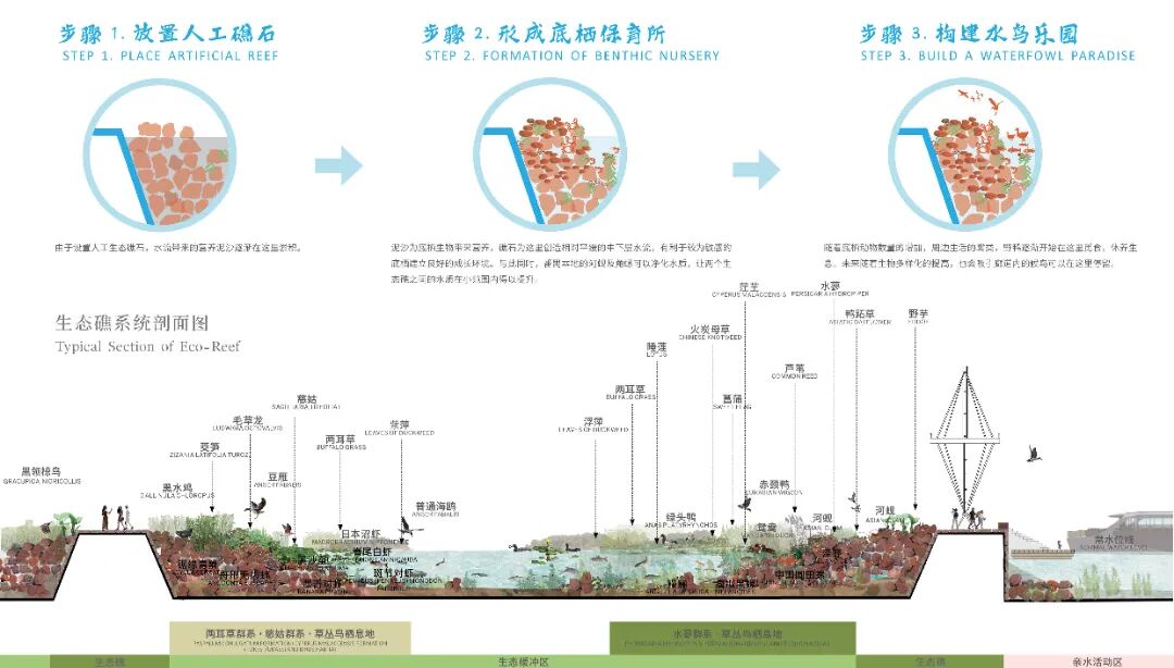 方案中浮出水面的山岩间,嵌入了潮水交汇的湿润浅滩和栖息地,千百年来此消彼长。方案中一系列像突出到水边的山岗:可以称之为露出水面的山脊、或礁石码头。它们之间嵌入丰富的生态空间和栖息地。这些礁石码头也支撑着步行桥,跨越道路与河流,划分出一个个景观“房间”,容纳多种多样的功能。每个礁石码头都设有小船停泊处,也是一个潜在的渡轮停靠点。生态礁石间的孔隙,为当地的蚝类等底栖生物提供生境,它们净化了水质,使更多的鱼类和水生植物得以在这里生长。