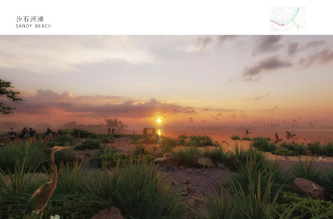 生态休闲水岸重塑后航道水岸的滩涂、森林、岛屿及山石栖息地。