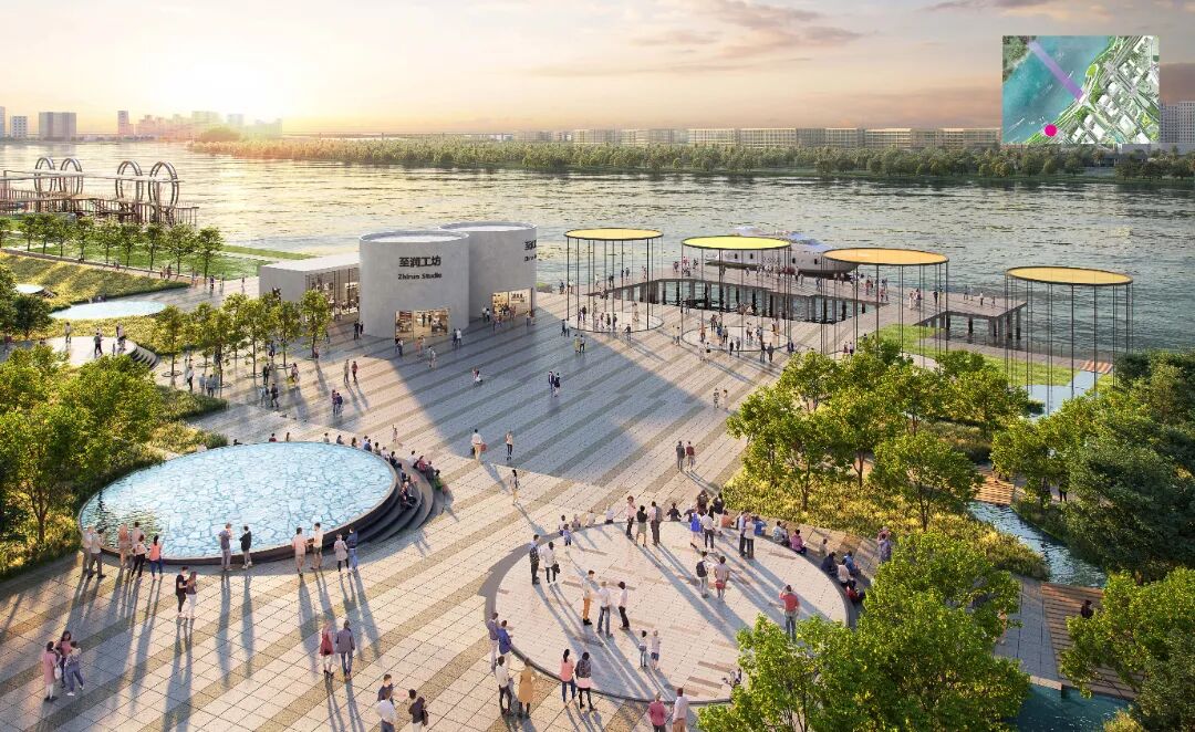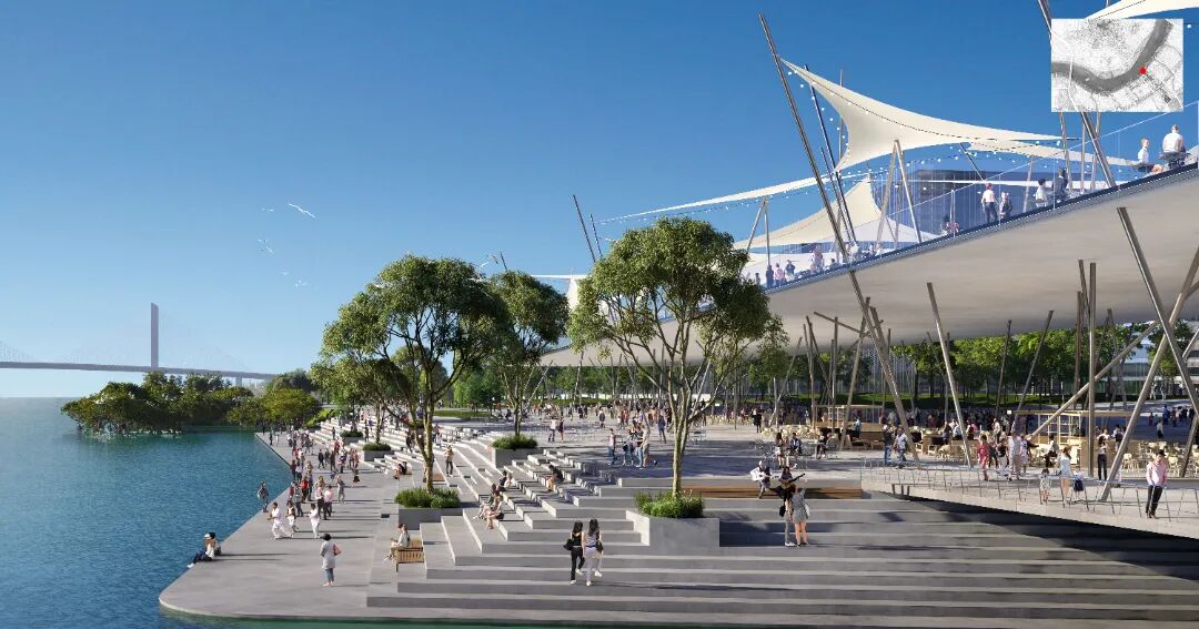 滨江示范段是创新城的重要门户。设计方案提出用生态路桥跨越滨河路连接城市中轴及滨水空间,创造延续的人行体验。路桥上方,餐饮亭阁坐落在具有现代岭南气息的芬芳花园,路桥下方提供游客中心、公厕等管理服务设施。大草坪、户外剧场、漂浮舞台提供了多样的市民活动及观演空间。