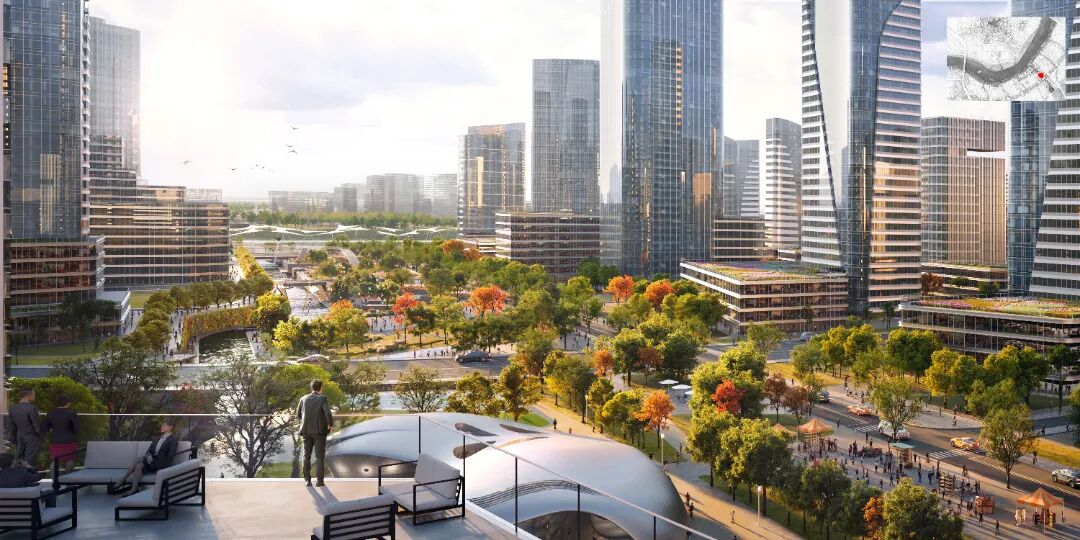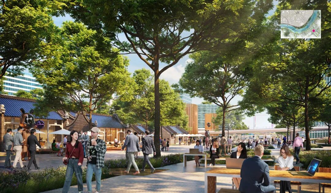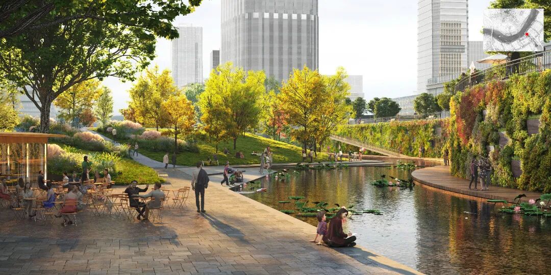 创新城中轴段专注于连接性、新的城市生态以及根植于现代岭南精神的多样化协作互动空间。中轴段以门户会展区与滨江绿带相连,向南串联起一系列城市森林绿荫下的雨水花园广场,并在最南端以地形起伏的南公园作为连接至更广阔的农田景观的节点。整体规划与相邻用地性质协调,强化了中轴段多元的城市功能、便捷的交通及优美的环境,建立了鼓励人与人互动的花园社交中心。