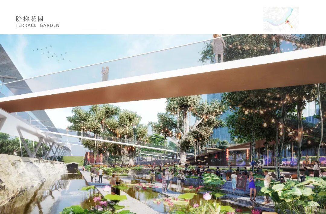 都市门户区,从番禺智慧桥延伸出立体慢行系统,桥下的山谷式空间,有层层溪流、岩石驳岸,呼应着番禺的丘陵景观。结合周边的智慧谷科技群,地铁枢纽和现有自然水道,形成了阶梯草坪、台地餐吧、树阵广场等。