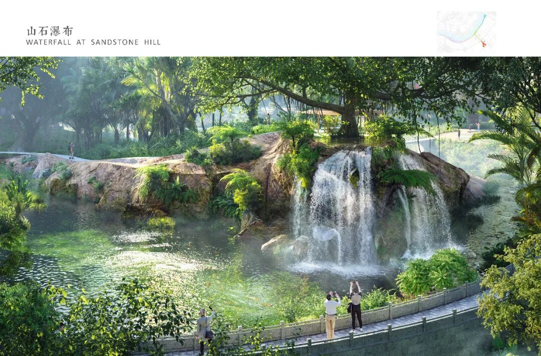 生态森林片区模仿番禺独特山-水-田地貌,它向南连接农田、山丘斑块,形成中轴的山水之心。