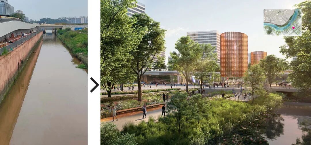曾边涌贯穿中轴,却因驳岸硬化、水质不佳等原因未能发挥其应有的生态效益。设计方案以完善的城市生态沟网络、雨水花园和台地湿地净化城市径流,并以植栽软化曾边涌驳岸,有效地提升曾边涌水质及景观价值。
