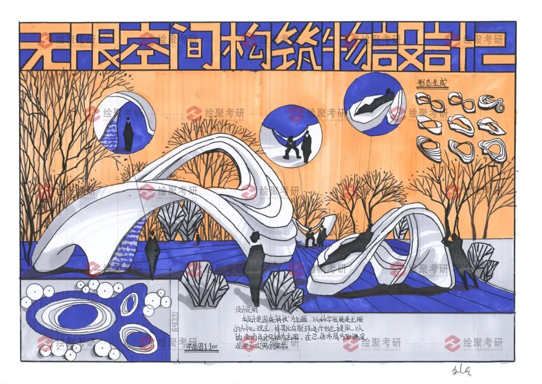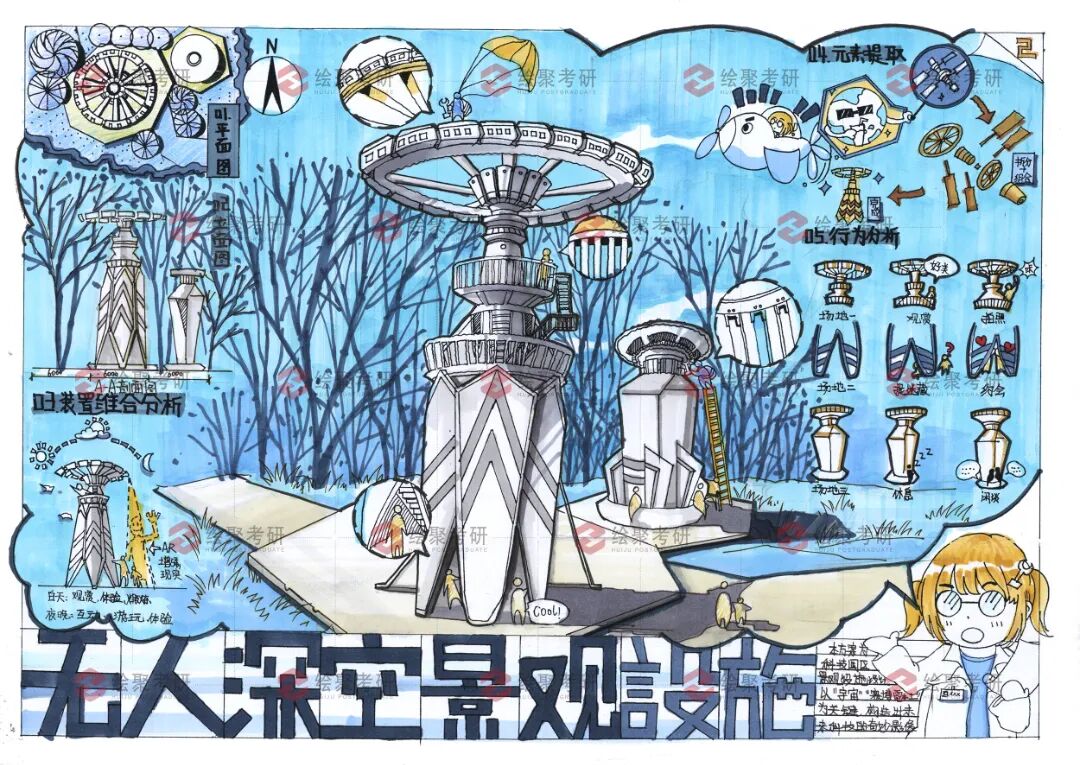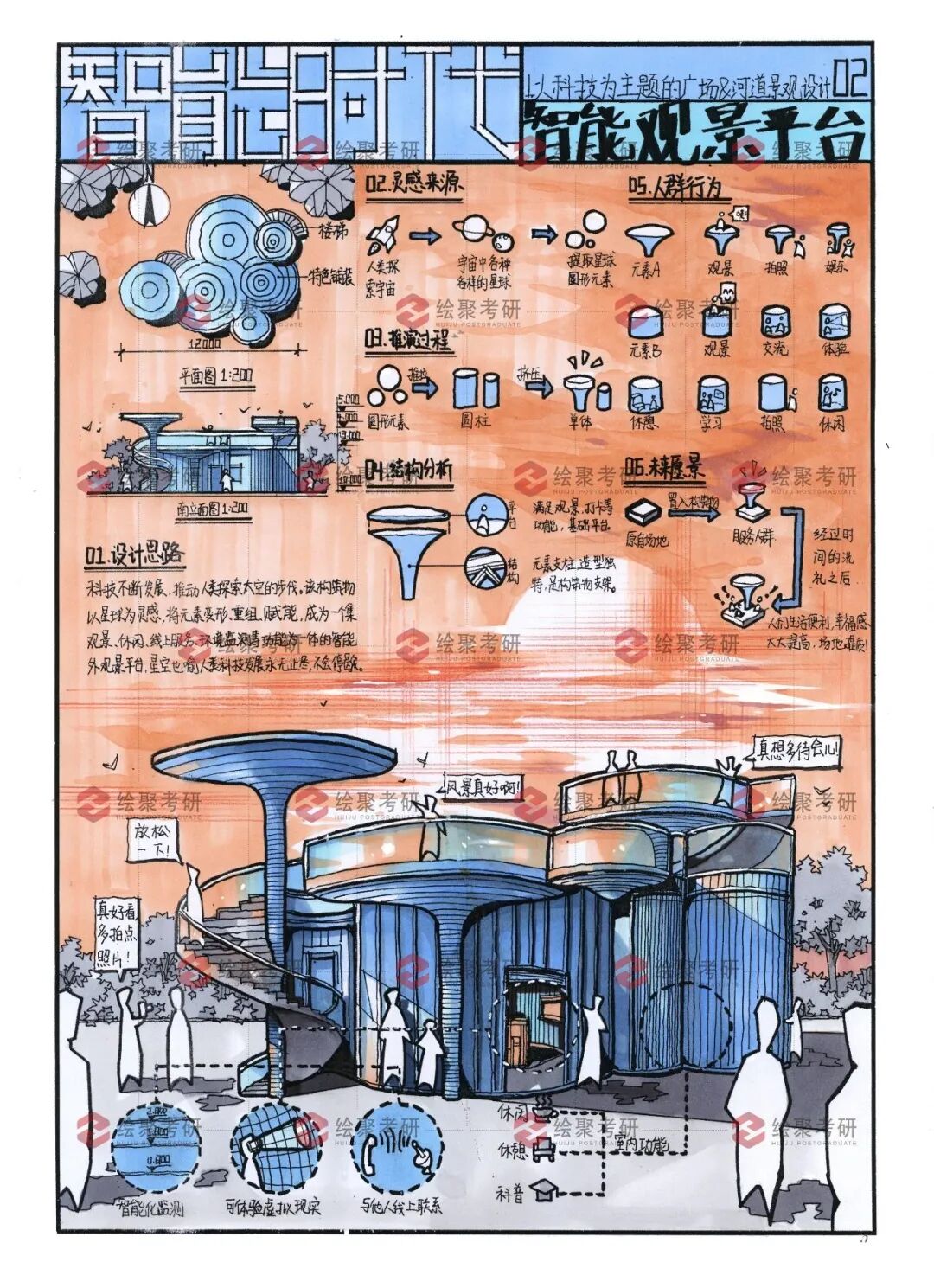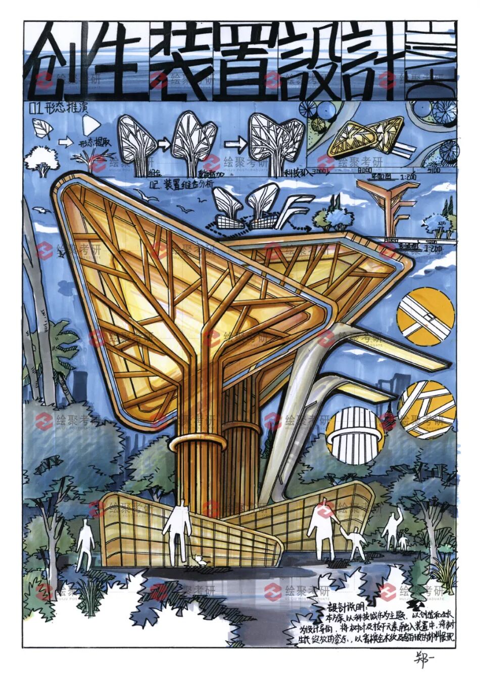 结合主题及平面布局、相关功能流线设计景观构筑物,并深入刻画表达。