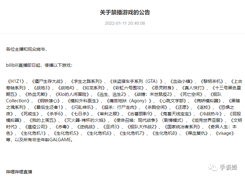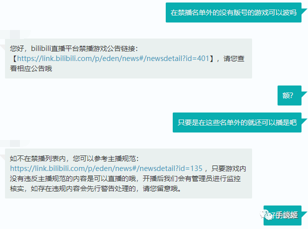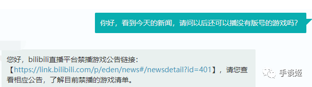 手谈姬又去询问了B站直播的客服,得到了禁播游戏还是依照今年年初发布的停播游戏公告实行的答复。