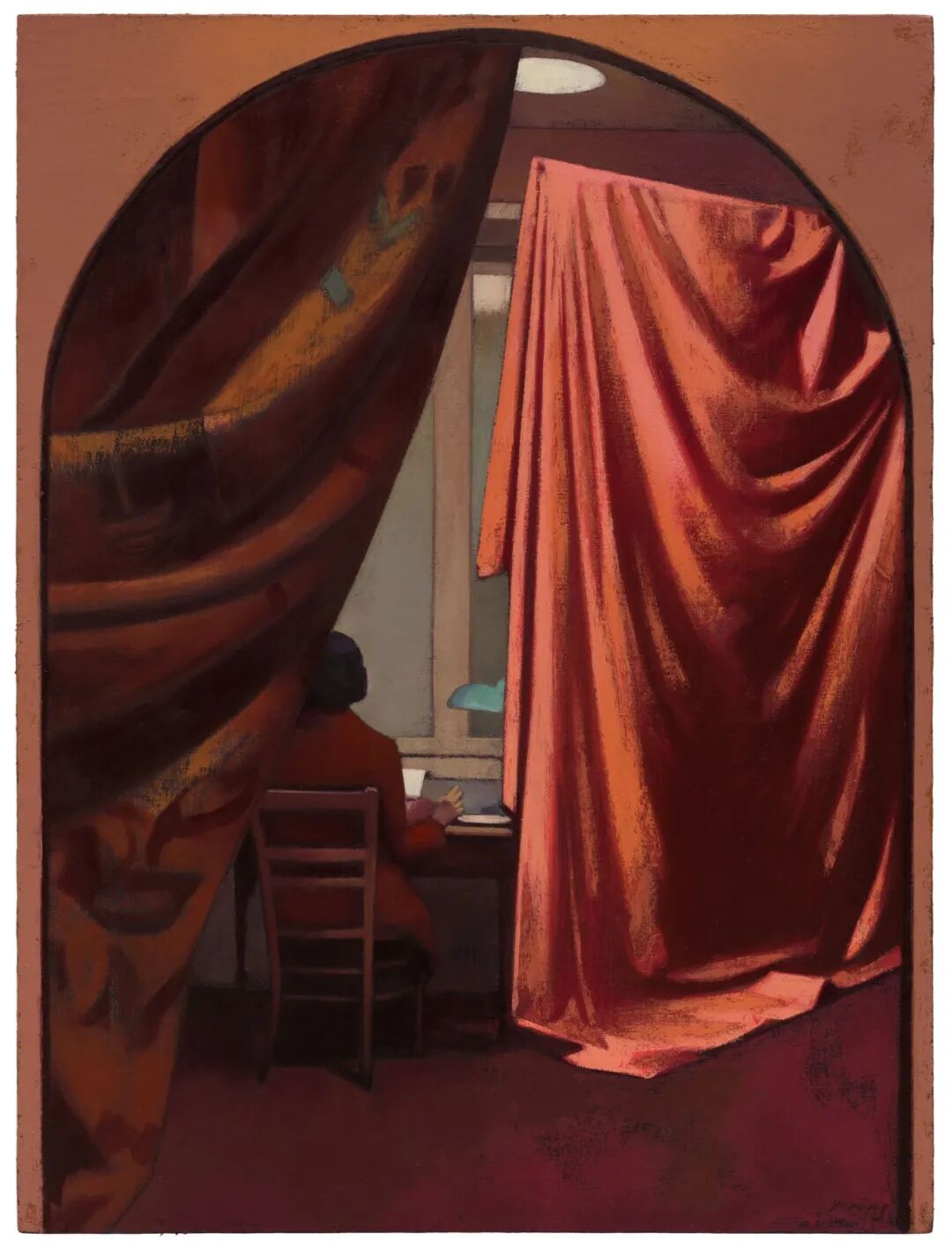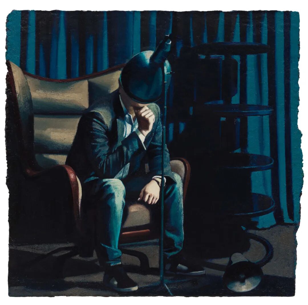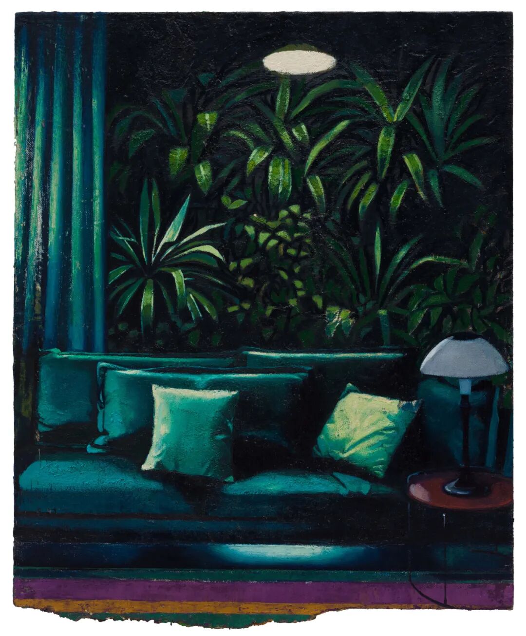 “室内”是张业兴经常描绘的场景,它们往往来自于我们记忆中似曾相识的片段,一盏夜灯,几段帘幕,角落里丛生的绿植。“帘布”与“帷幔”是画中故事的道具,也是阻隔观看的屏障。张业兴对于如何在绘画中思考故事和空间关系,有着极大的兴趣,画中的形式总是能将故事掩藏,将观众的所见之物引向漂浮的“此刻”,像是“刚刚发生”和“已然结束”的不确定关系。犹如夜晚的窗帘,拉开帘布,一个窗外的无限世界若隐若现,拉下帘布,屋内发生着自己的故事,夜晚,人们在卧室,在客厅,记忆在不完整的时空中流淌:在夜色的遮蔽下,每个人都过着极其有趣的生活。