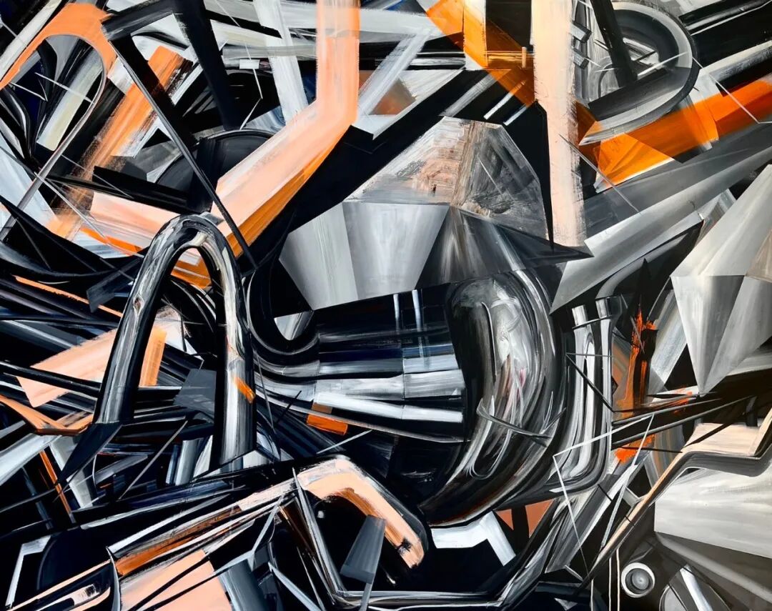 “迭奏”并非是对袁乐单幅作品的描述,而是作品和作品之间的关系,它们之间形式、秩序、结构、速度之间交替的变量。这种变量有时来自于现实中的不同物像,机械运动的美感,管道扭转的复杂,或是一次偶然的撞击;有时来自于绘画自身的历史,立体派的语法,表现主义的张力,抽象艺术的秩序。双重的变奏组成了画面中的直线与曲线,形状与动感。对于“速度”的强调,在袁乐画面中尤为明显,它来自于机械时代的变革与更替,金属的光感与质变,也是个人生活的不断加速,创作快感在画面中的显形。“迭奏”对于袁乐,既是绘画语言的韵律,亦是快速变更的时代生活的写照。