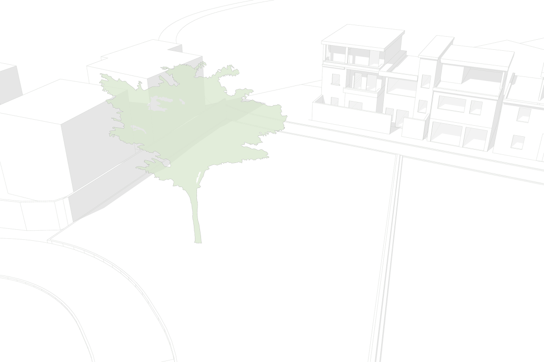 我们把建设场地选在入口广场左侧,紧邻停车场,靠着石泉山环形步道的一边,另一边是几户线性排开的民宅。场地中有几棵树围绕空出一块较为完整的地方,我们把建筑定在了这里。