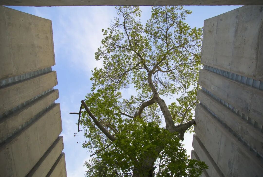 设计师不希望楼梯跑的锯齿形形状在这个横平竖直的建筑外形里出现,就给楼梯跑包了一个方盒子。发现旁边有棵现状树,就把上下两跑楼梯及其盒子分开,避开树木,放置在两侧,连起之间的休息平台,把树木半包围在里面。这样,人往上爬楼梯的时候,是随着步级围树而上的,从树根部到树冠,立体地转一圈,犹如藏民转经一样,在这里人们是在“转树”:人在运动过程中似乎与树产生了某种微妙的关系。而一棵树形成的小院子,对于室内室外的空间渗透与光影体验等丰富性,都产生了意想不到的生动。